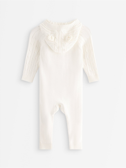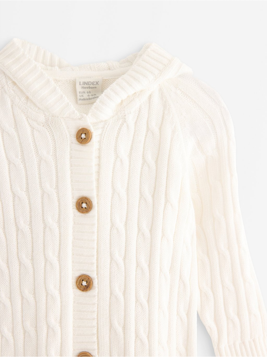 Cable-knitted jumpsuit in soft cotton with a hood and button closure.