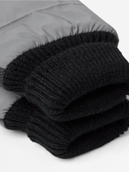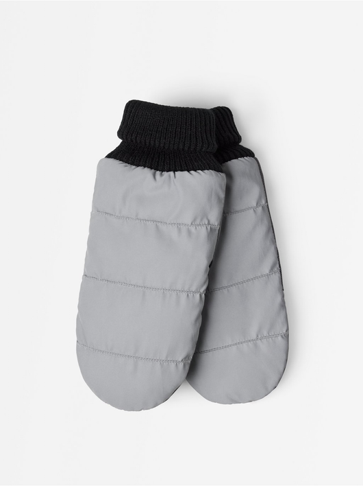 Padded, reflective mittens with ribbed cuff and reinforced palm.