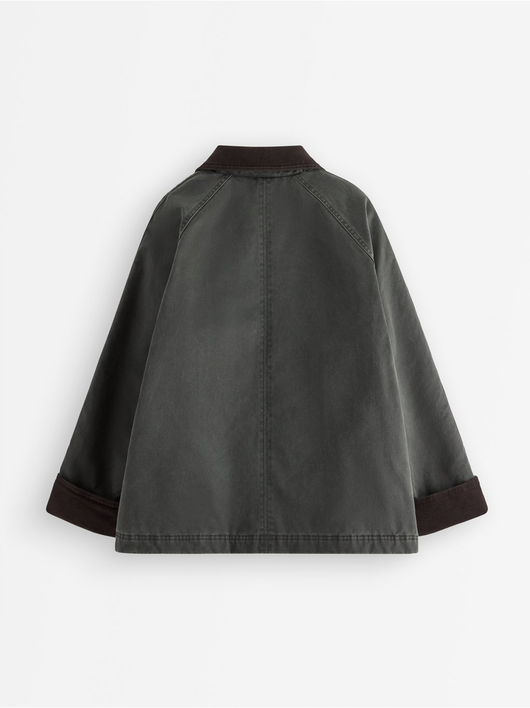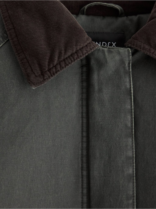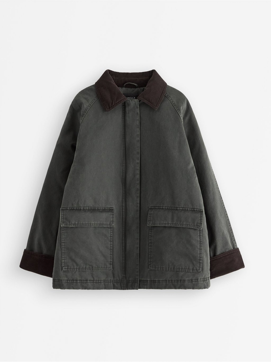 Padded jacket with a coated surface and corduroy at collar stand and at sleeve cuffs.