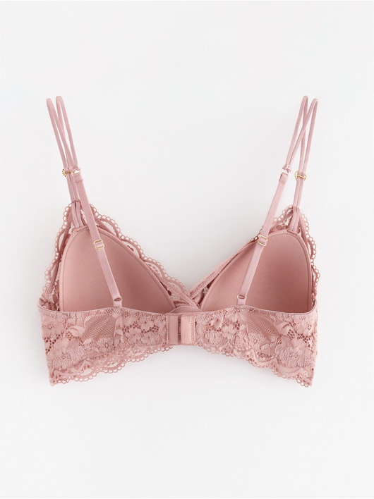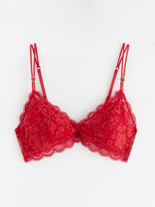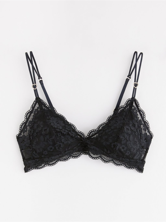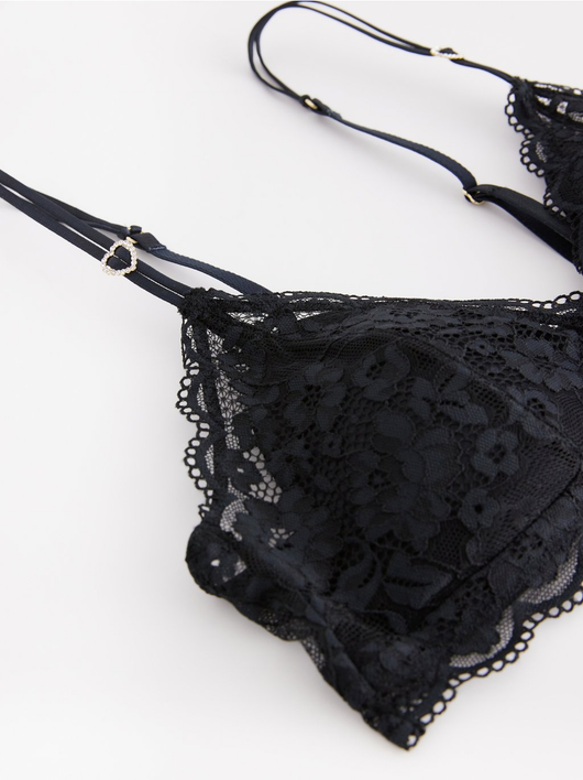 Soft padded bralette in lace with slim shoulder straps decorated with rhinestone hearts.
