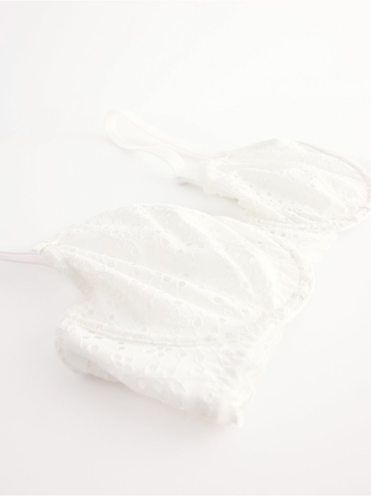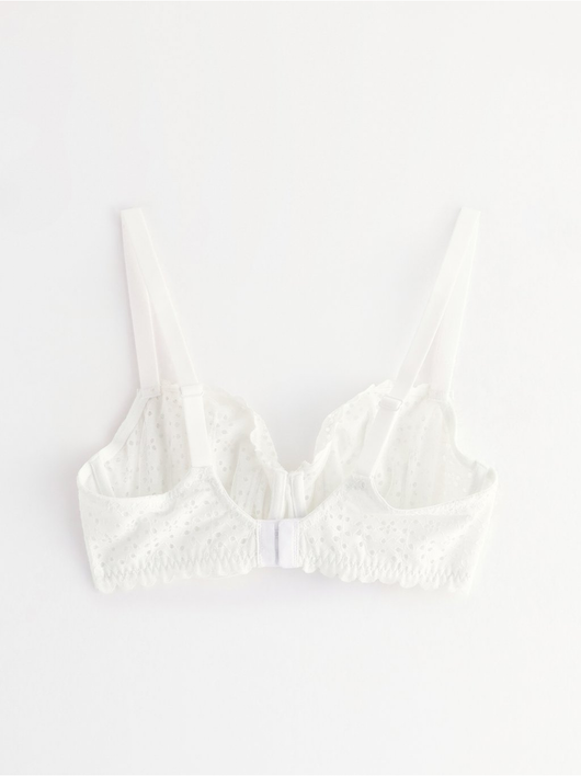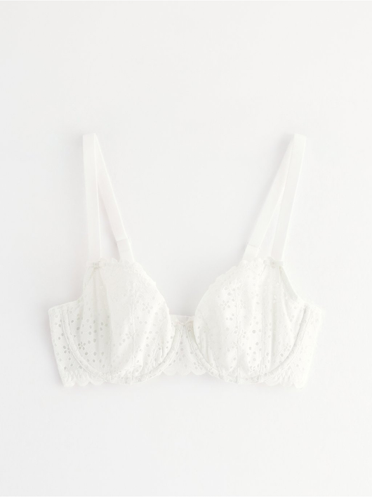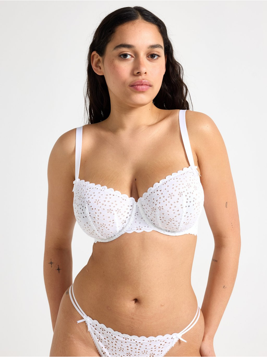 A wire bra designed for fuller busts, offering extra support. It comes in a soft beautiful broderie anglaise and comfortable wide shoulder straps.