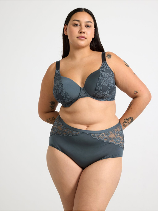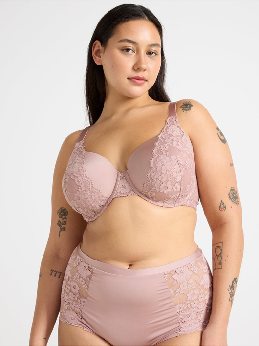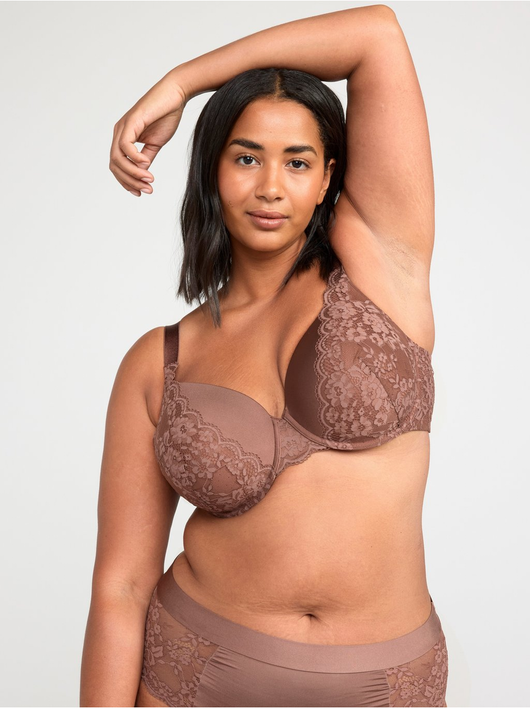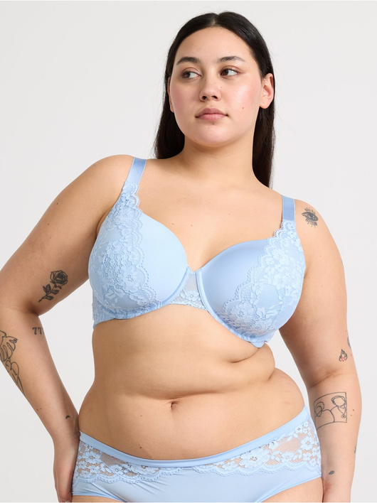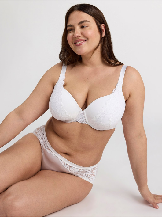 T-shirt bra with full coverage level, soft, thin padding and wide shoulder straps for good support. Comes with beautiful sheer lace details.