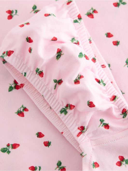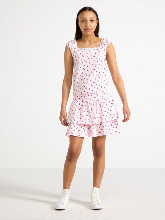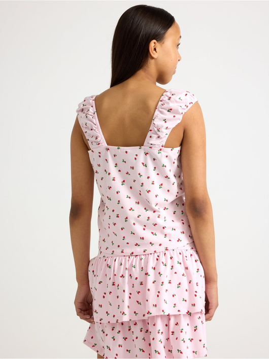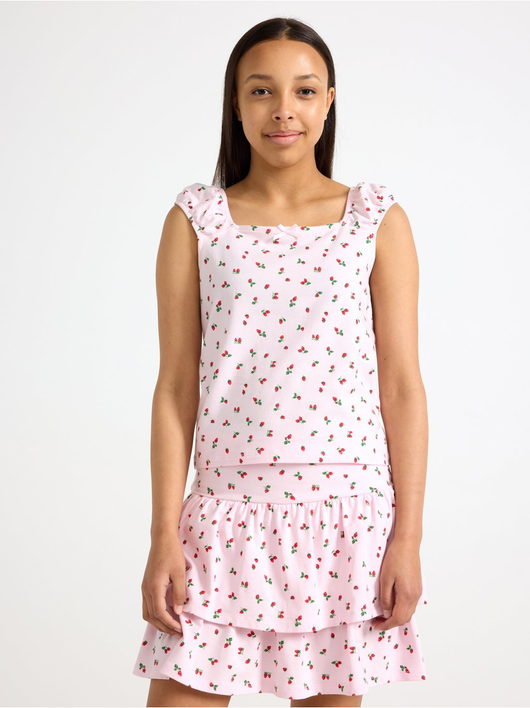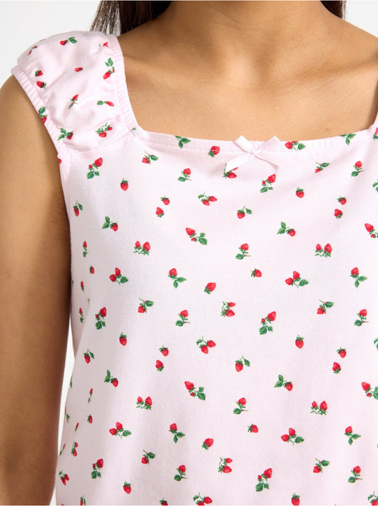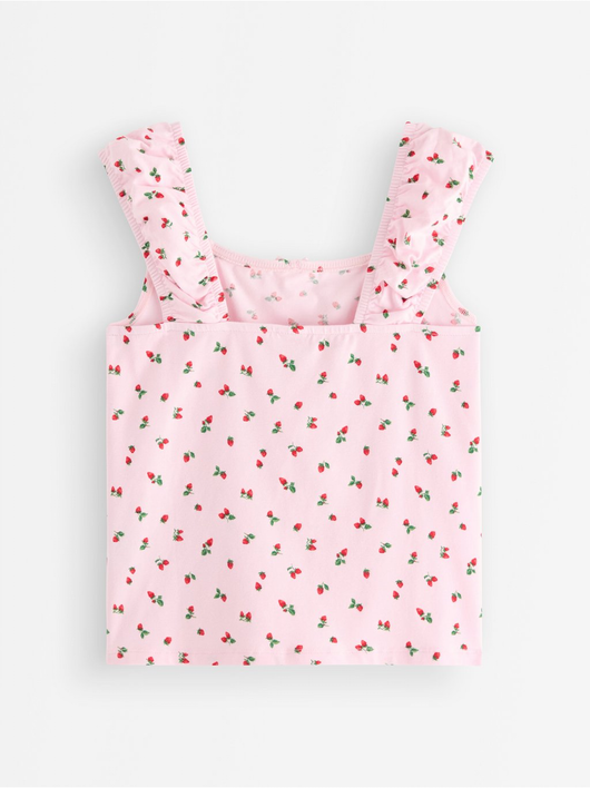Sleeveless top with an allover pattern and broad, elastic shoulder straps.