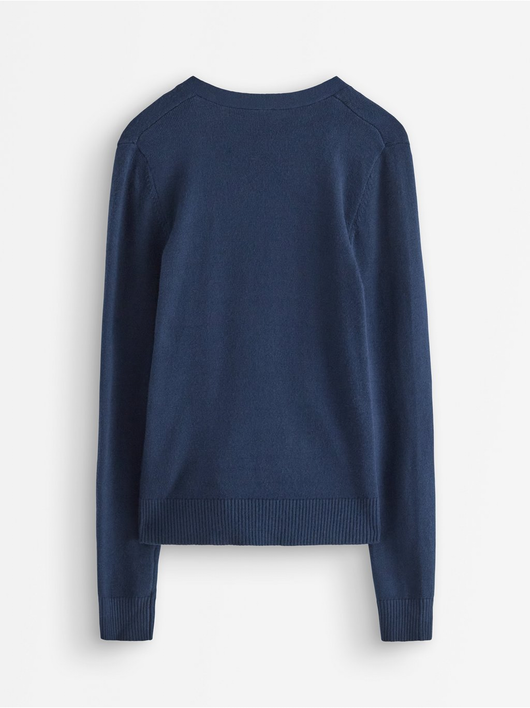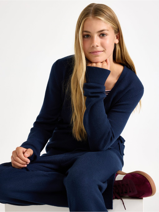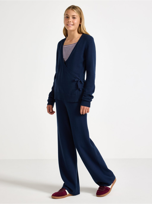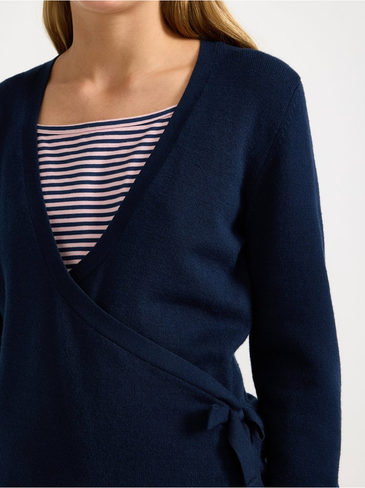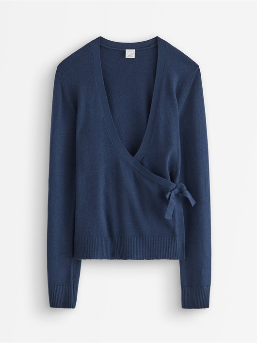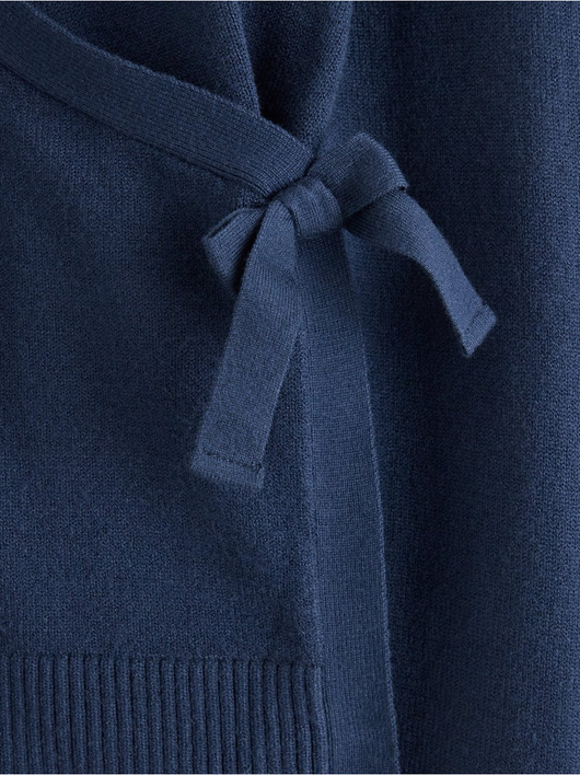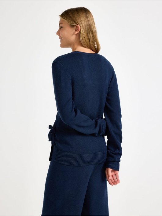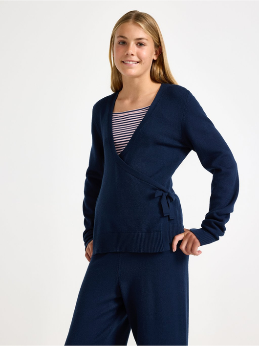 Knitted jumper in supersoft viscose with a wrap-look front and a cute bow detail. The wrap is stitched down to stay put.