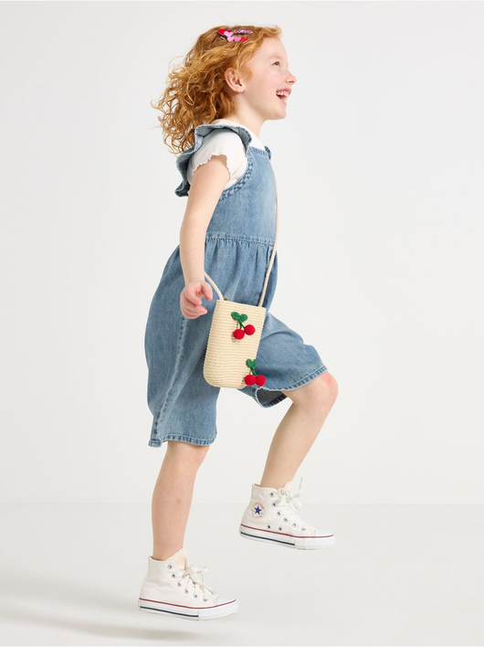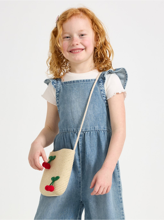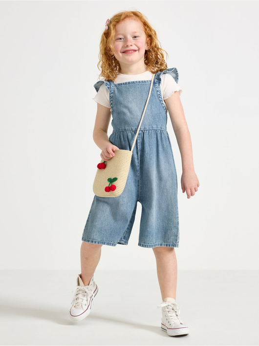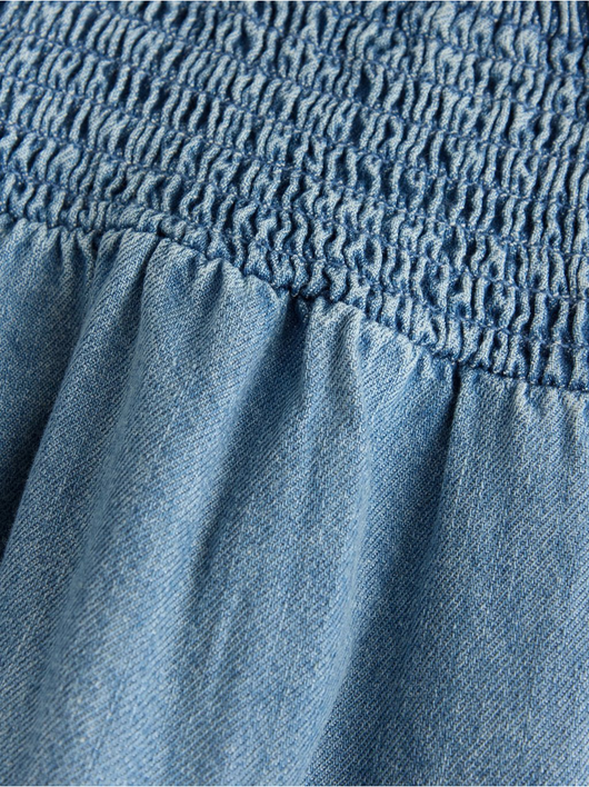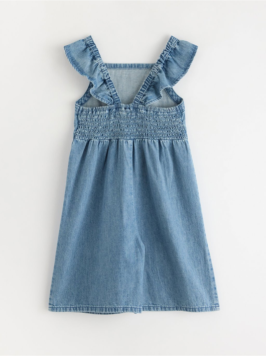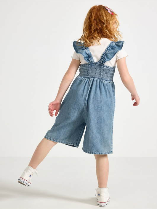 Jumpsuit in denim with flounce at shoulders and smock to back.