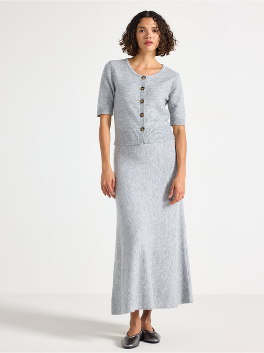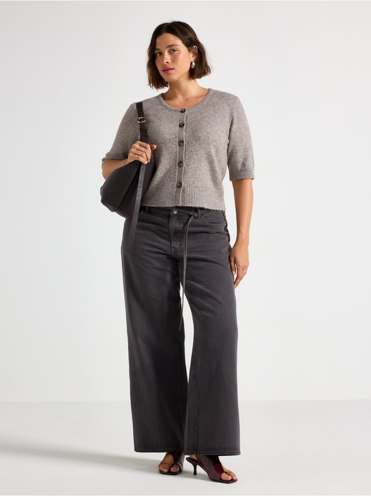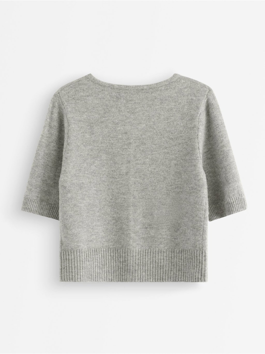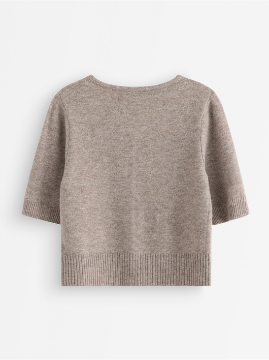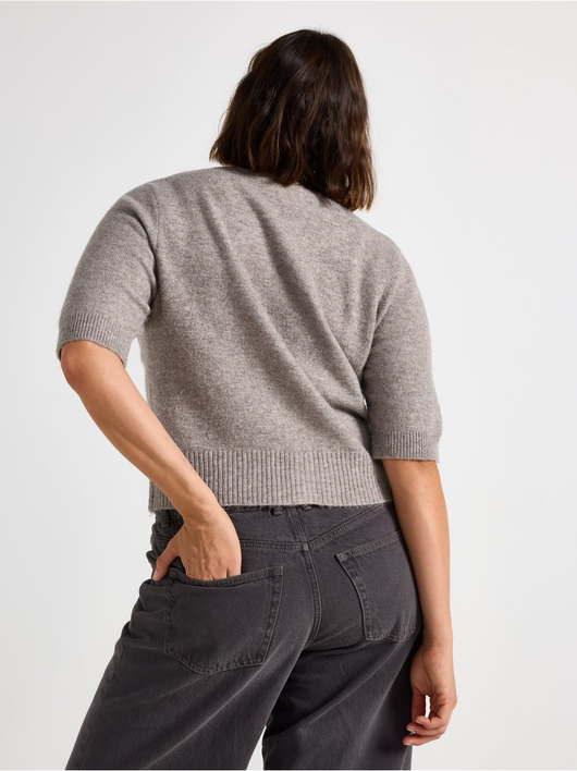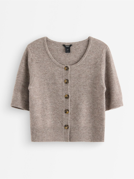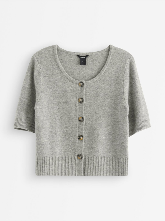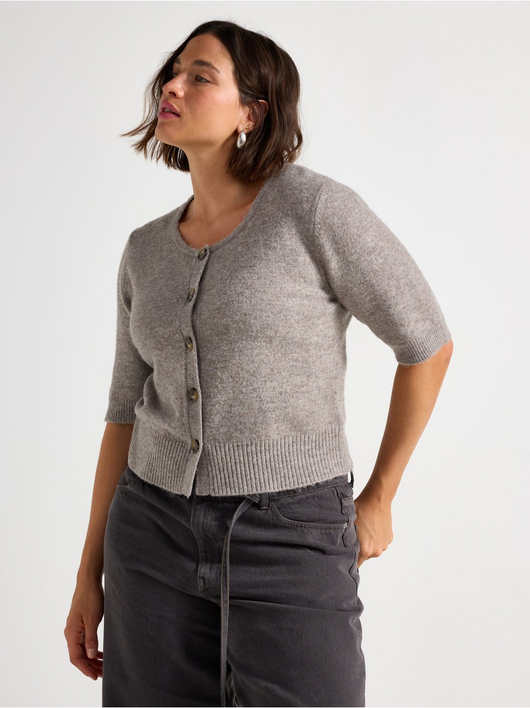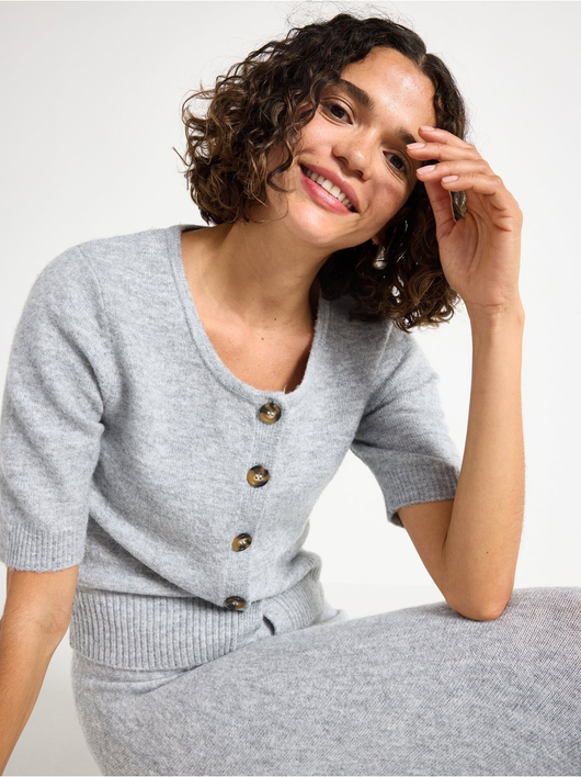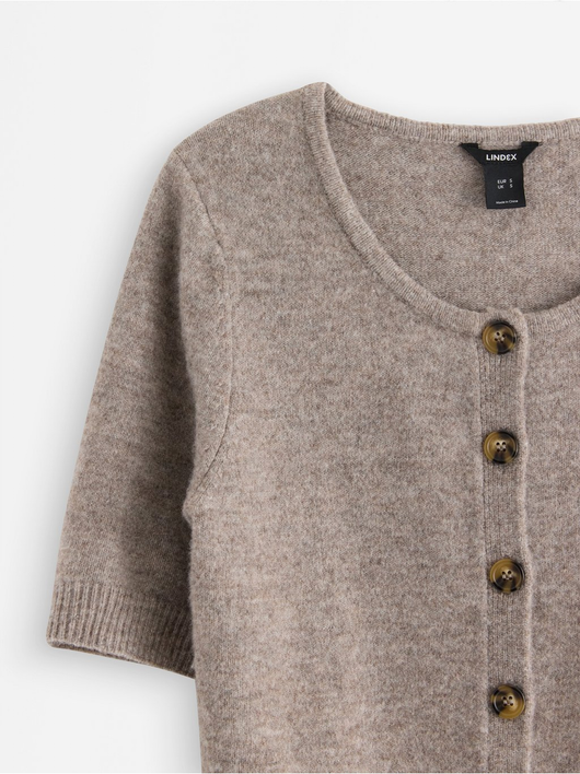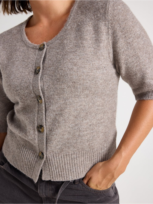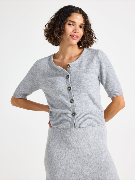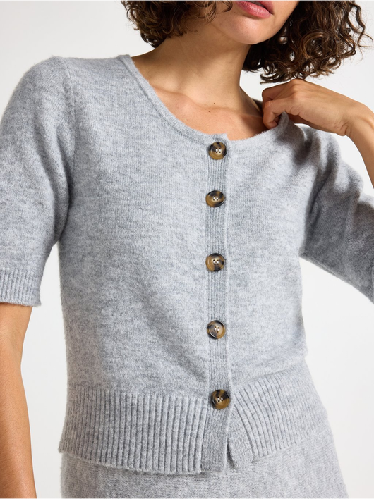 Soft cardigan with a round neckline, button closure, and short sleeves.