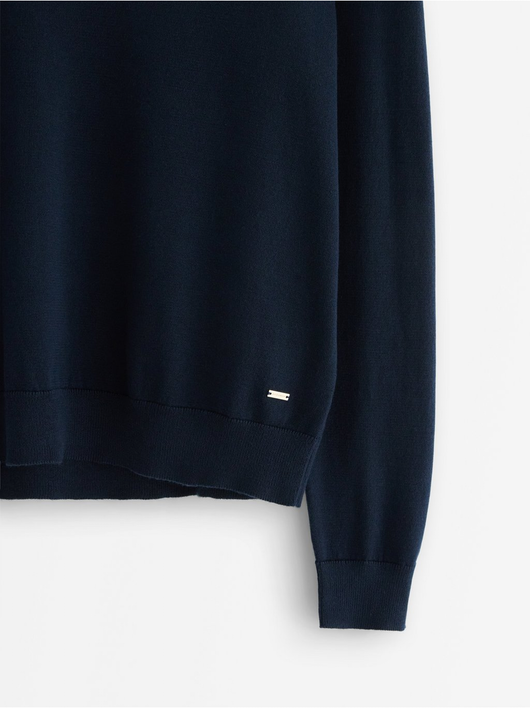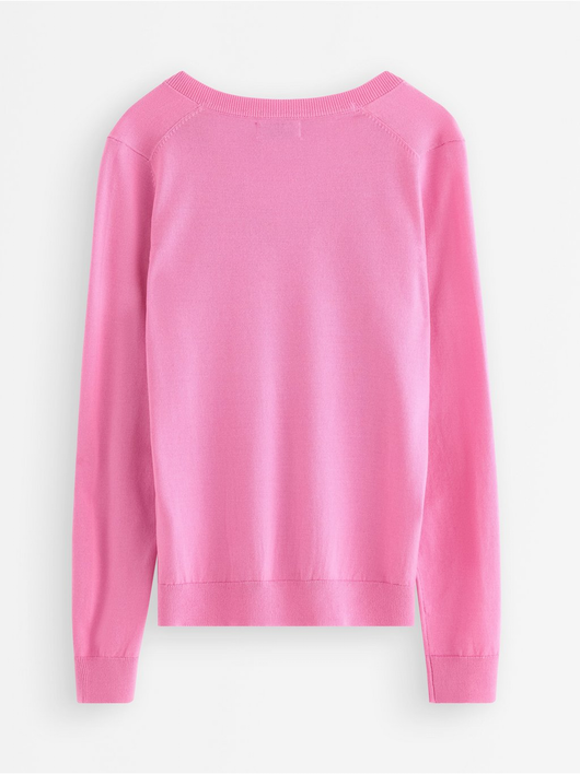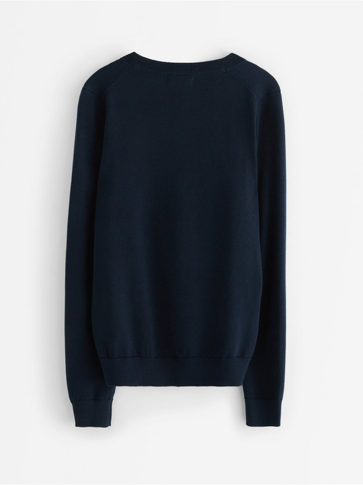 Fine knitted jumper with v-neck and ribbed cuffs.