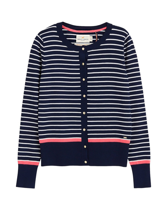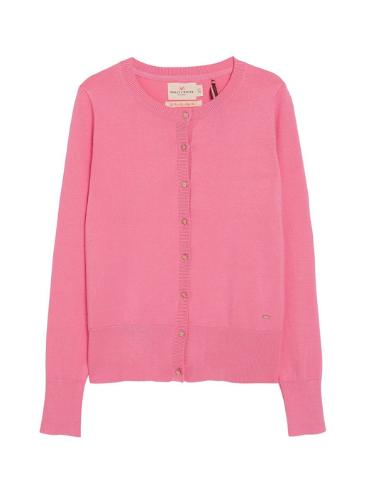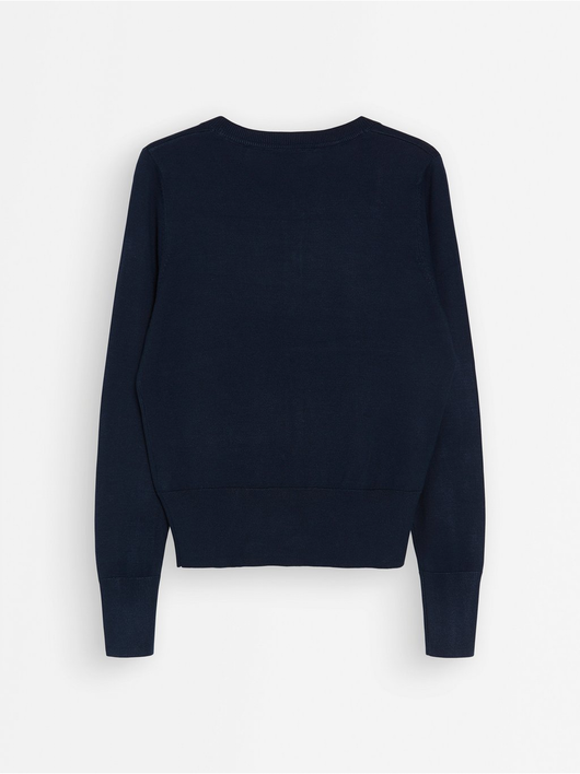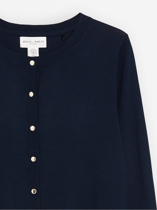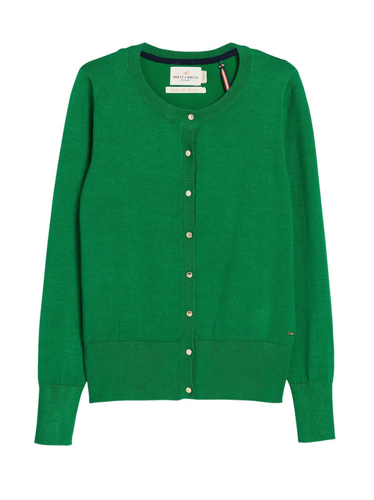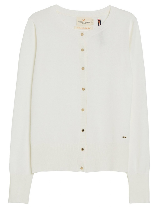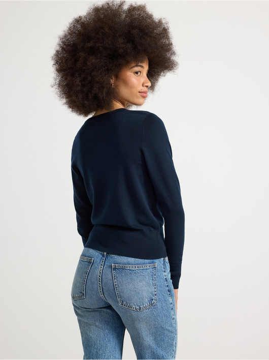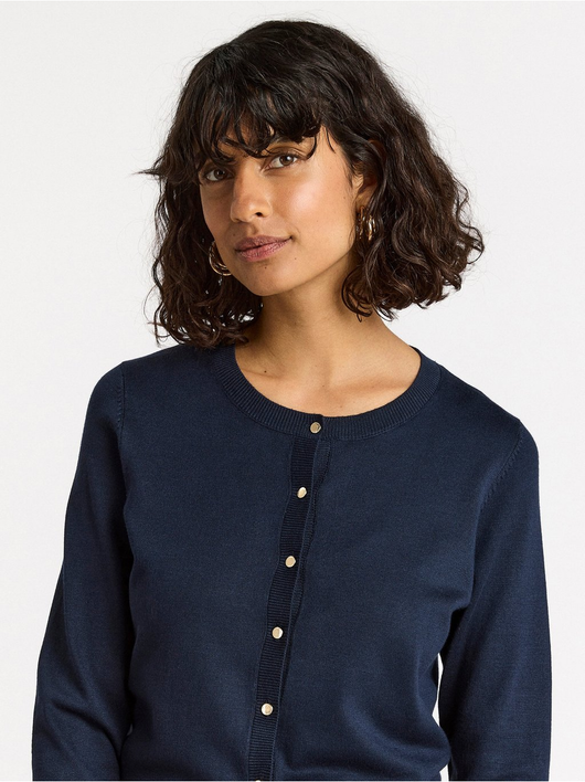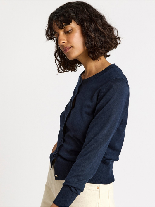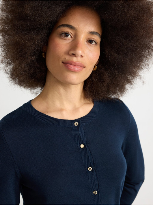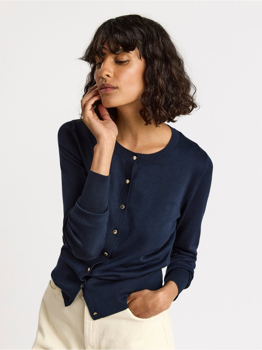A classic-looking cardigan with a slightly shorter fit. The soft, fine-knit fabric and the shiny buttons make this a versatile piece for both everyday wear and put over a party dress.
