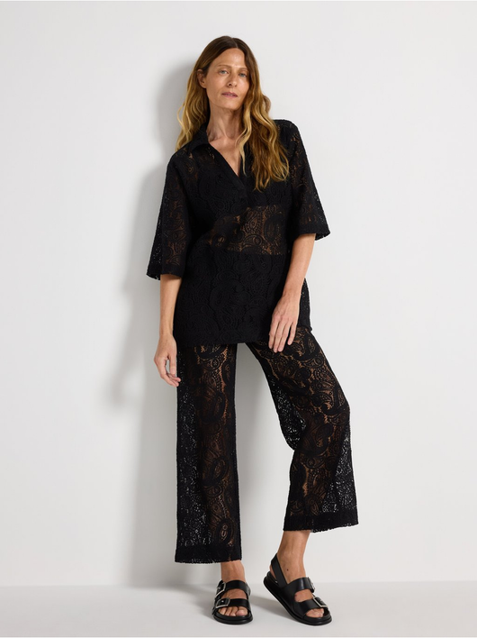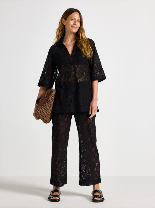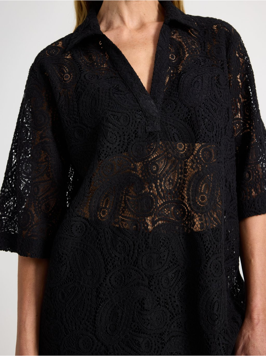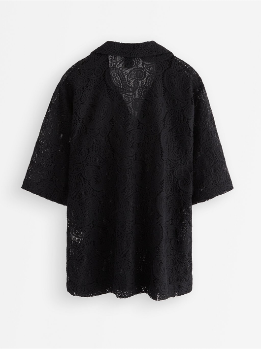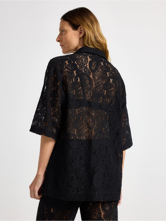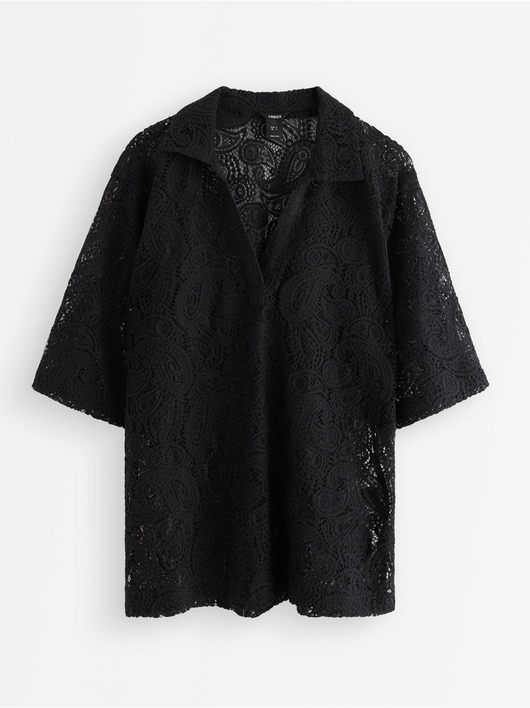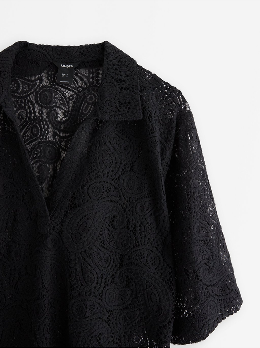 Short-sleeved, hole patterned blouse with v-neck and collar.