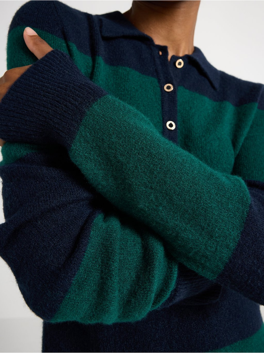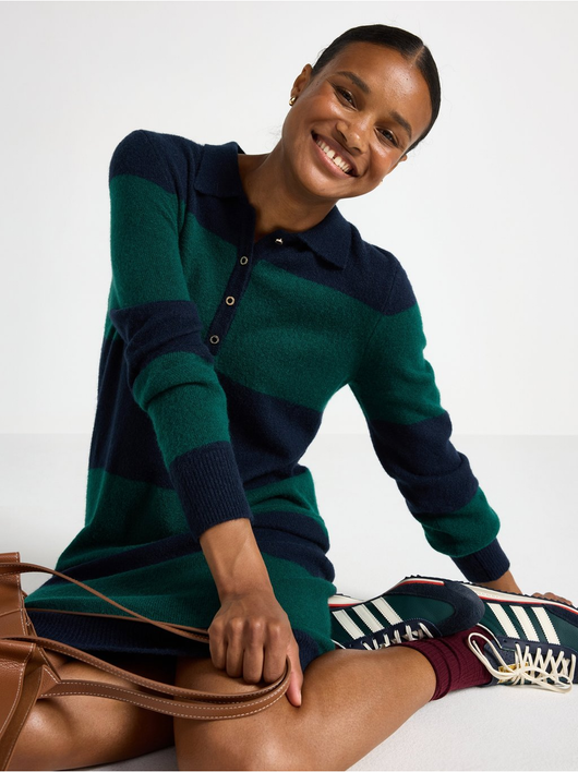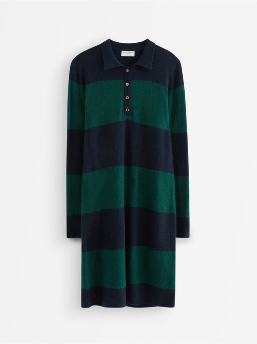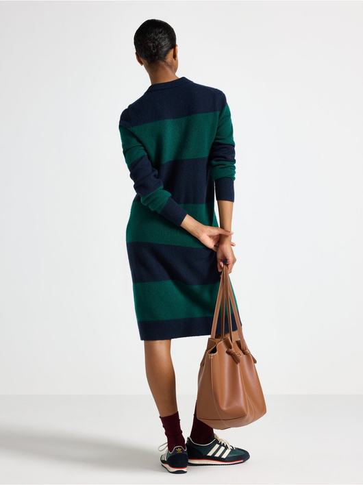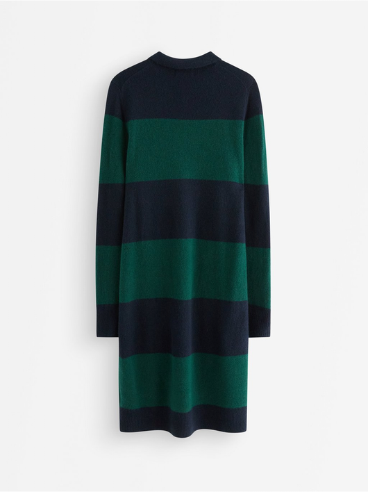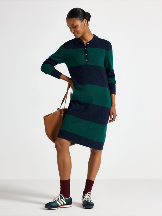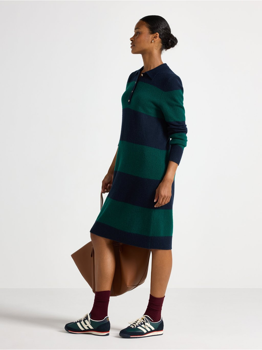 Fine-knitted, long-sleeved dress with collar and button placket.