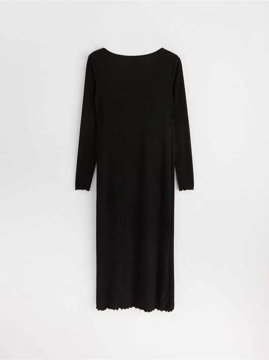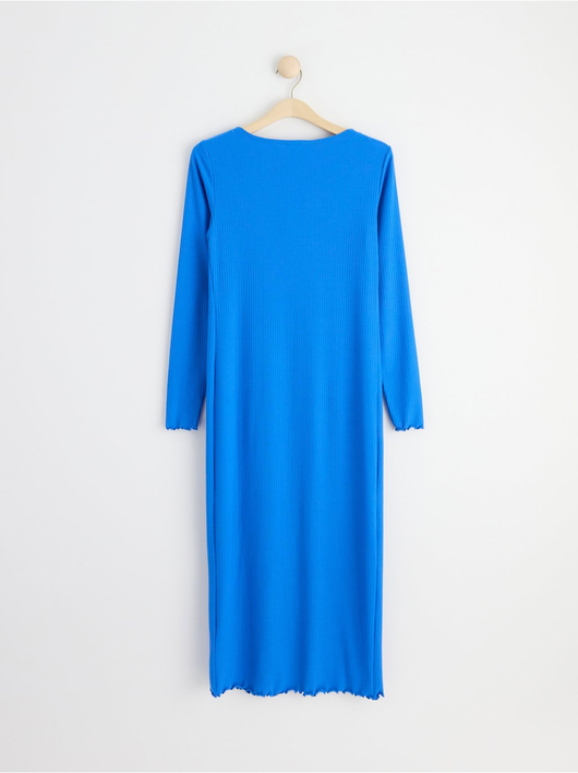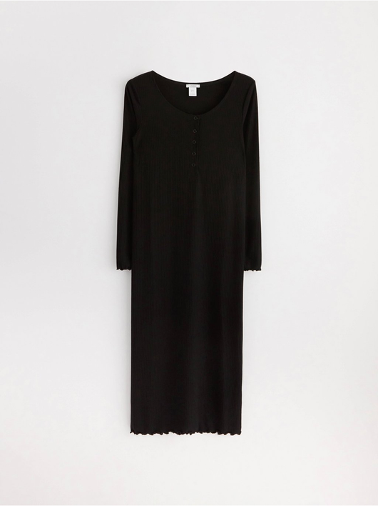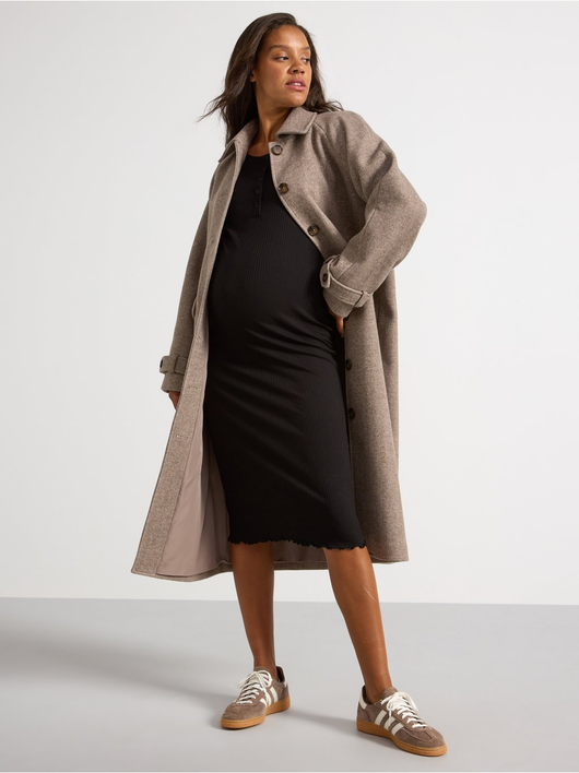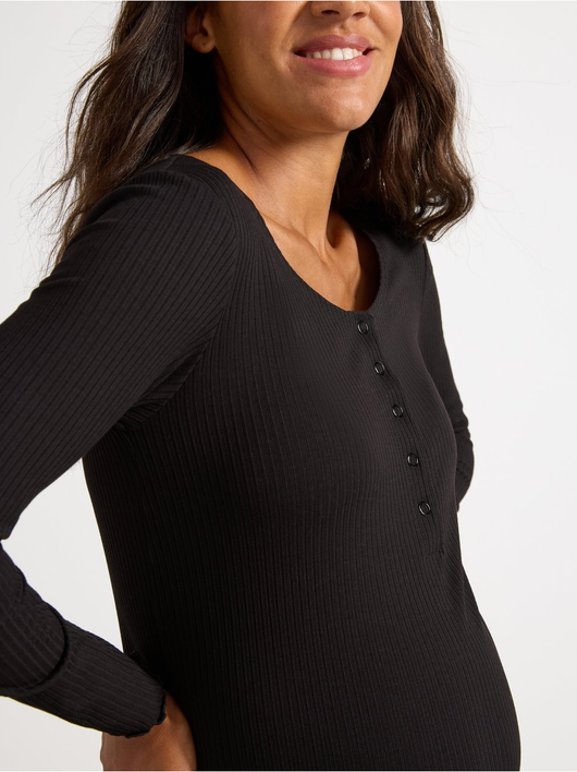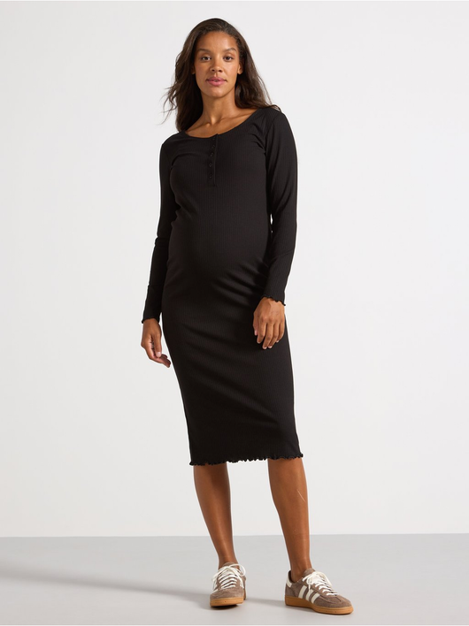 A soft long-sleeved dress in ribbed, stretchy jersey with extra room for the growing belly. Comes with a button placket to front and a wavy edge to bottom hem and sleeve openings.