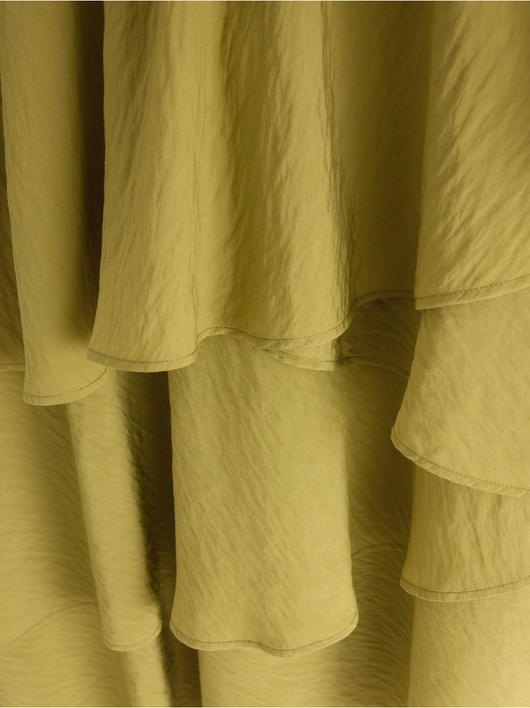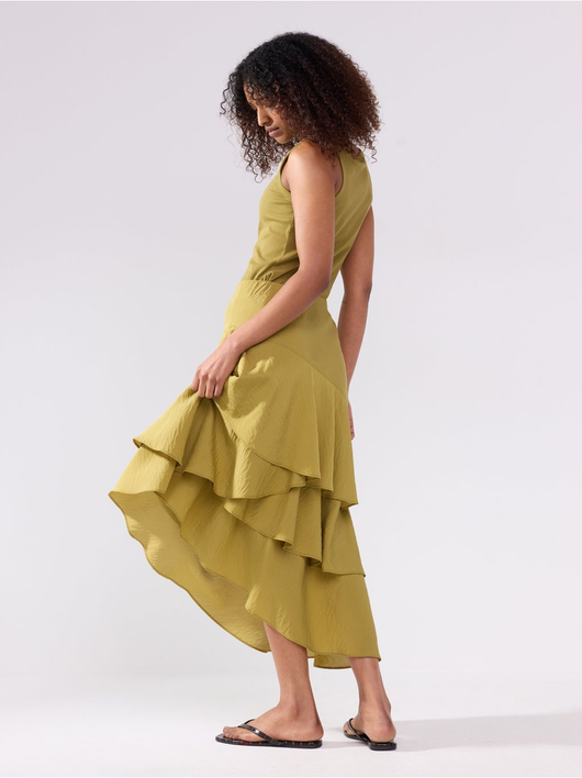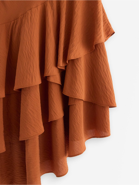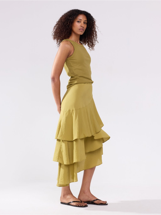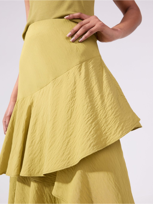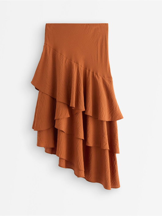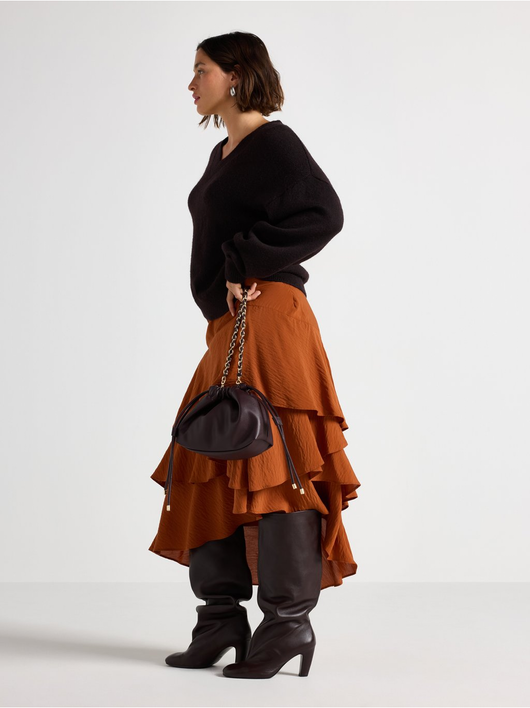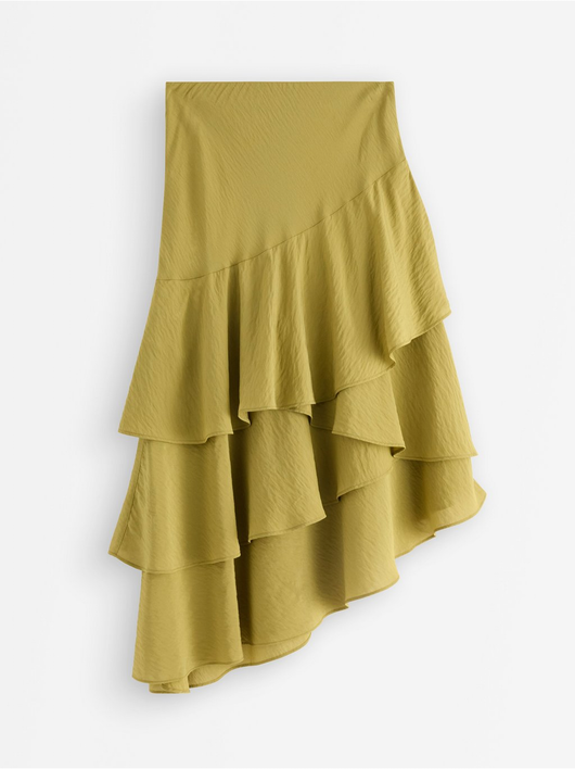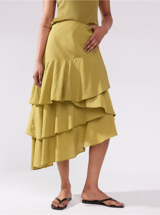 Flowing midi skirt in soft viscose blend with asymmetrical hem and flounces.