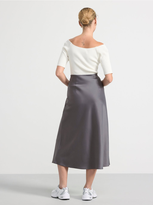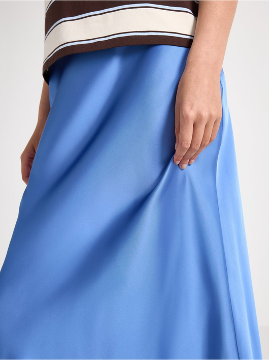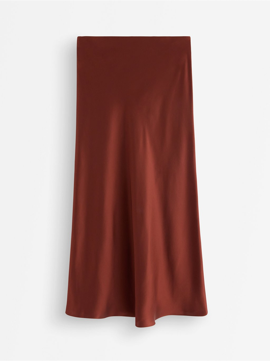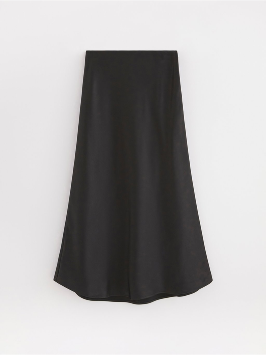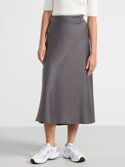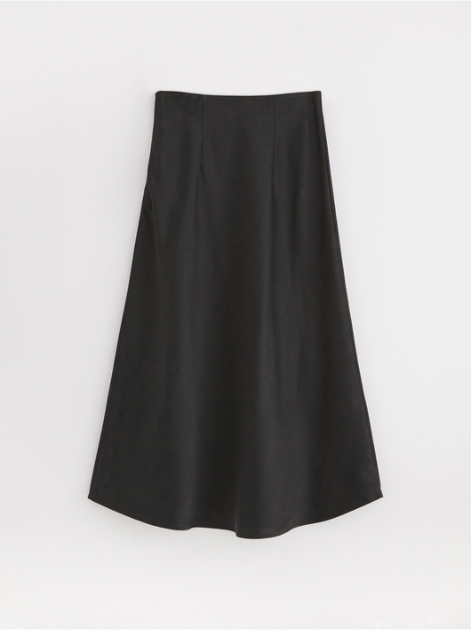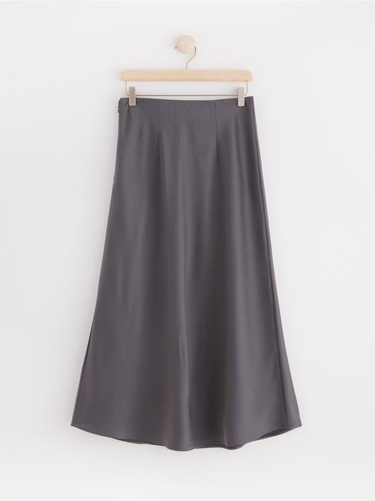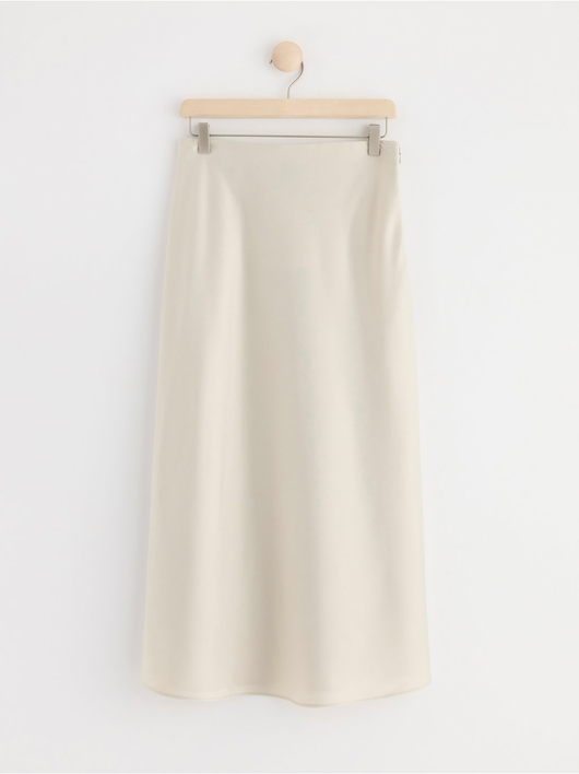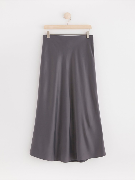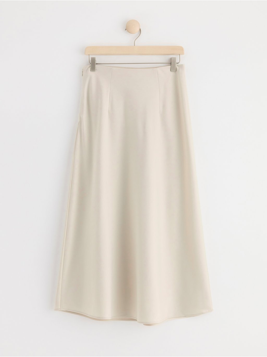 Sleek midi skirt with a slightly flared silhouette and a shiny satin finish.