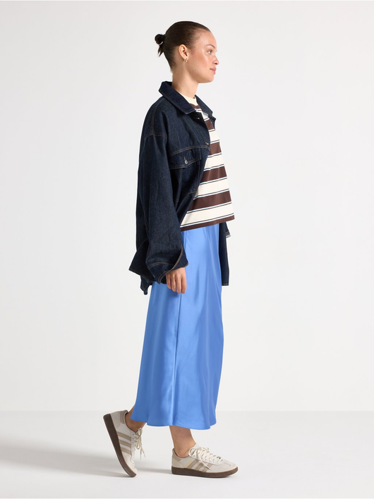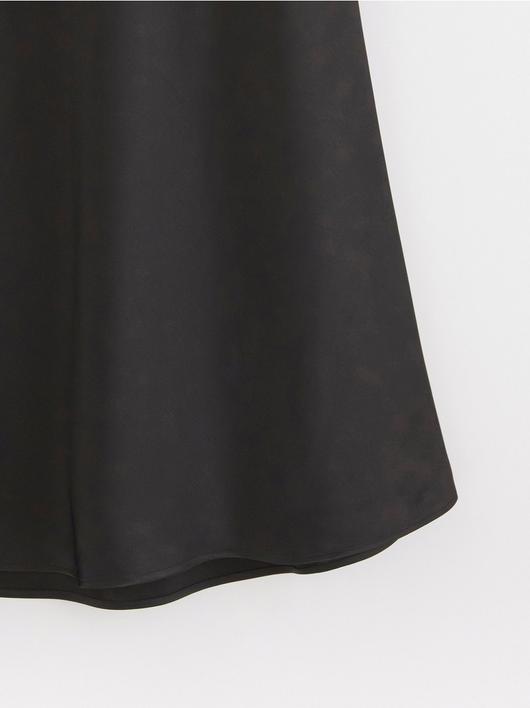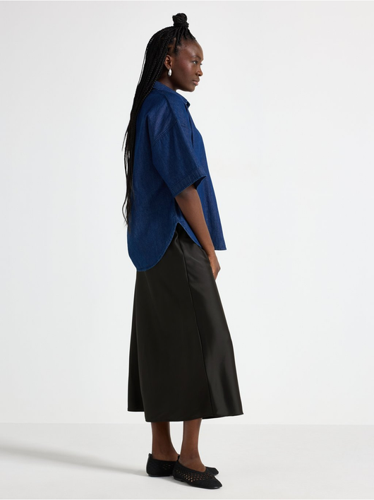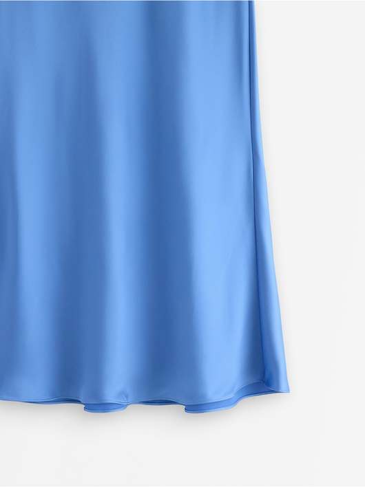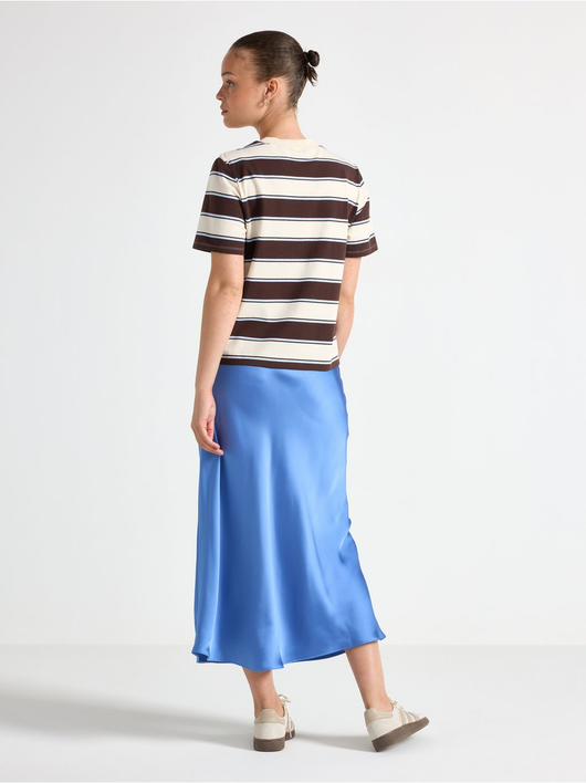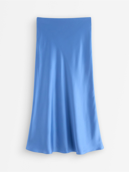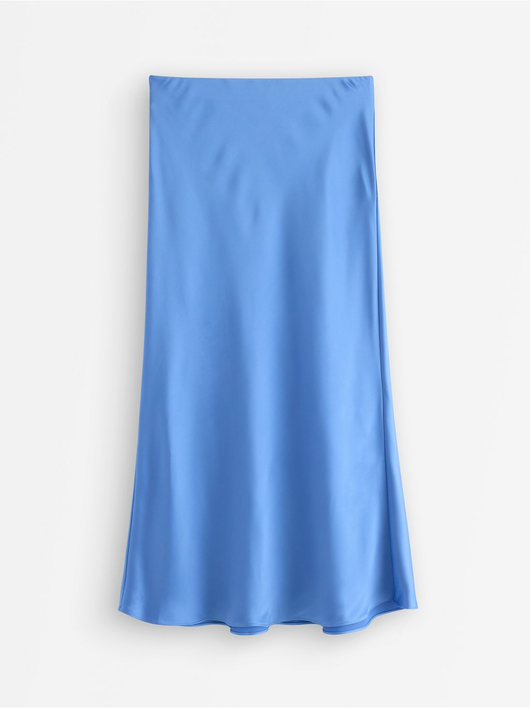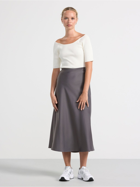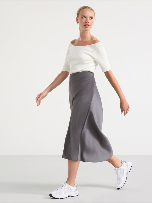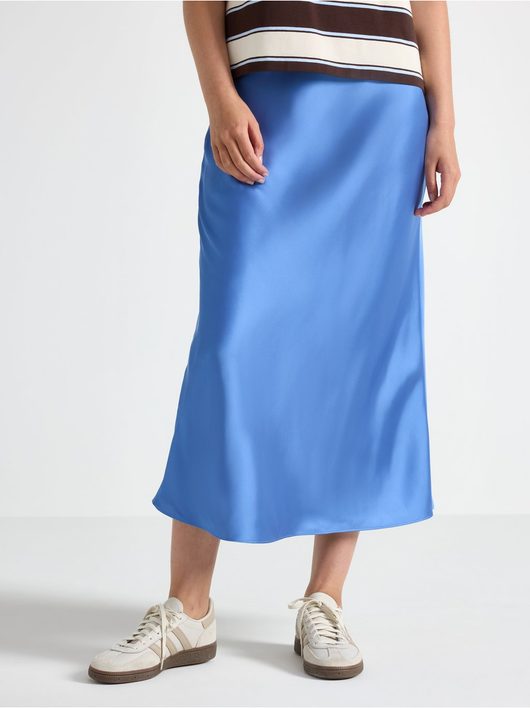 Sleek midi skirt with a slightly flared silhouette and a shiny satin finish.