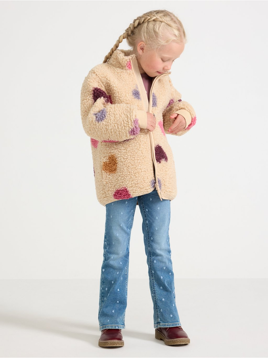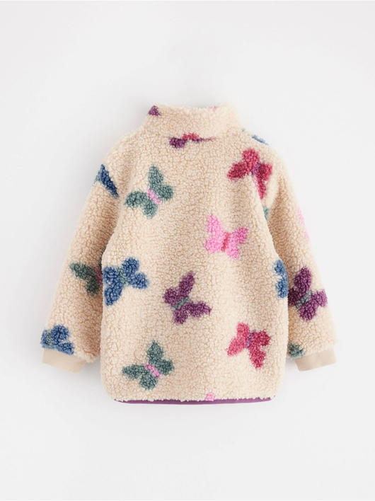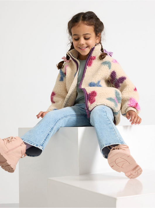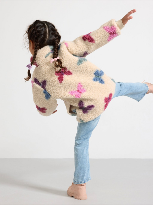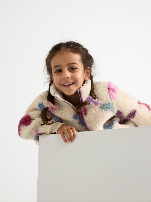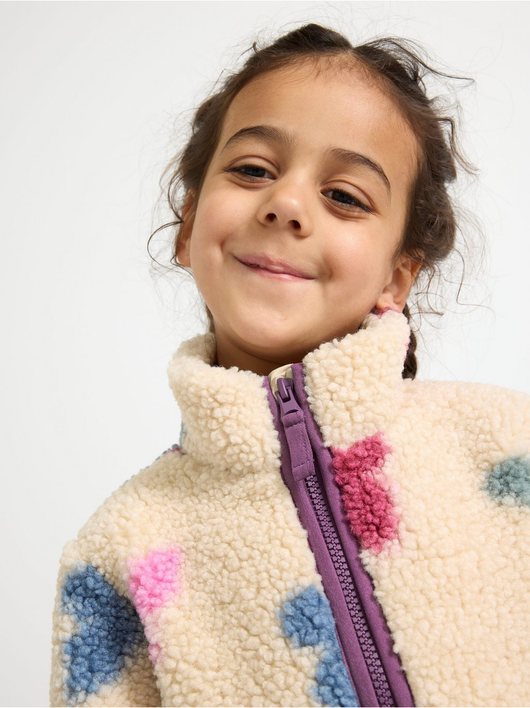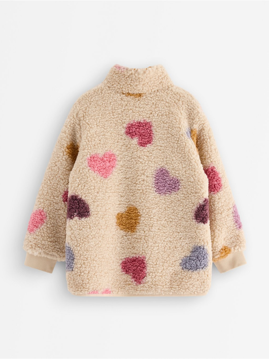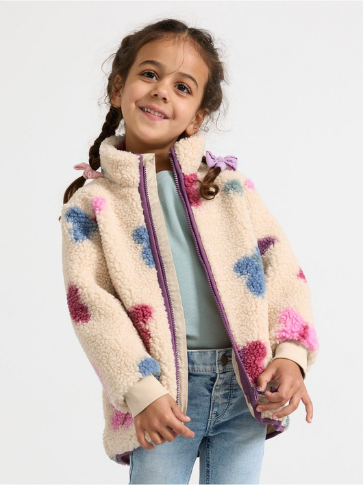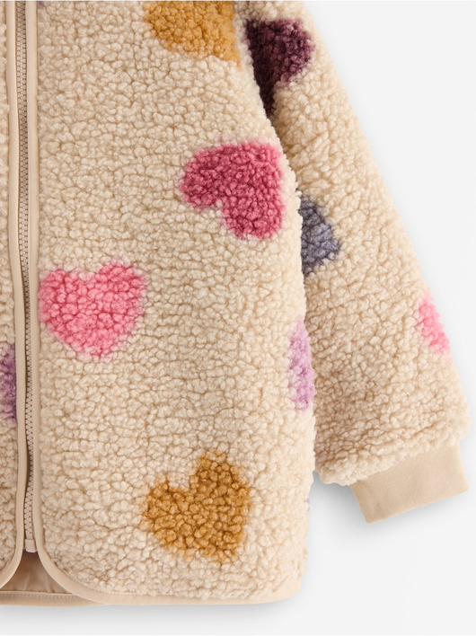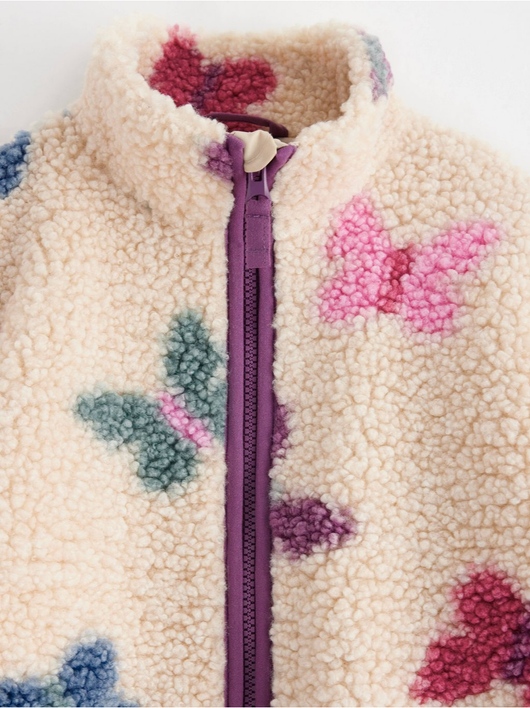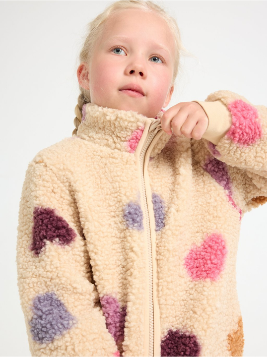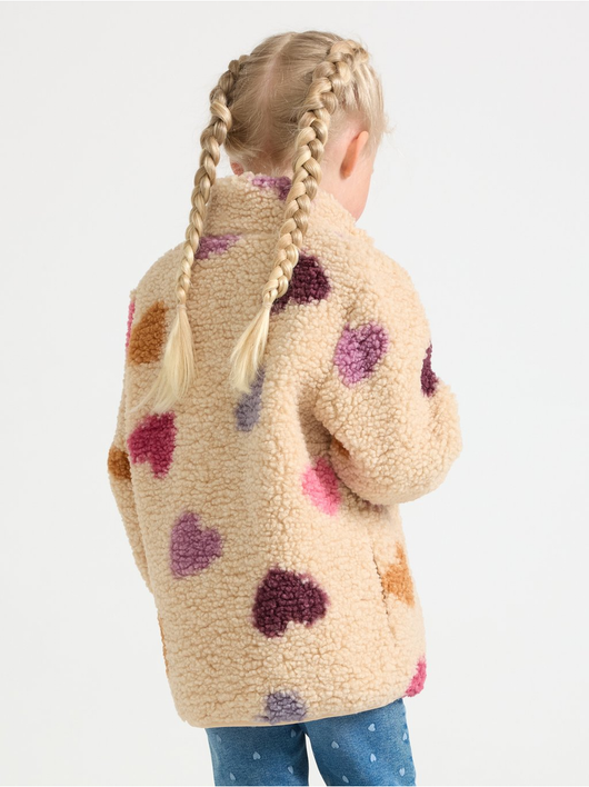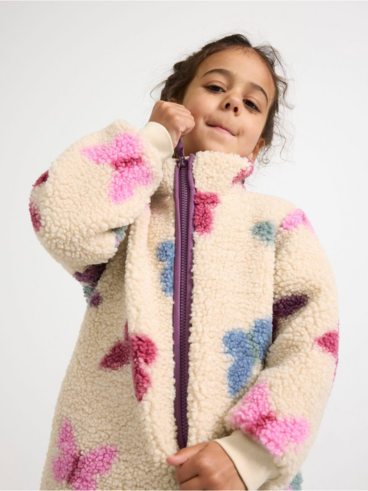 A warm and cosy pile jacket with side pockets and zipper to front.