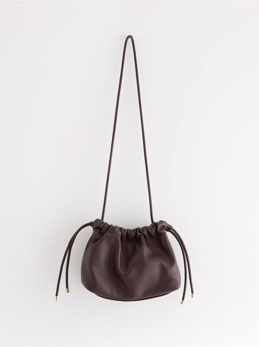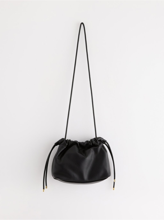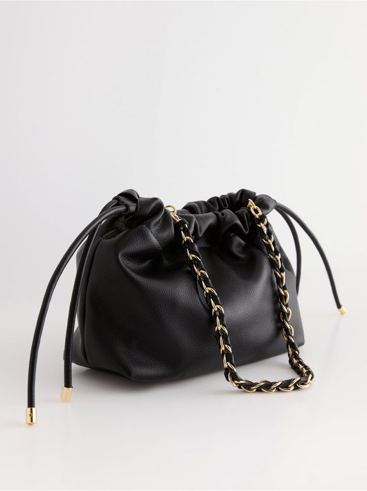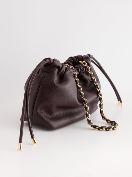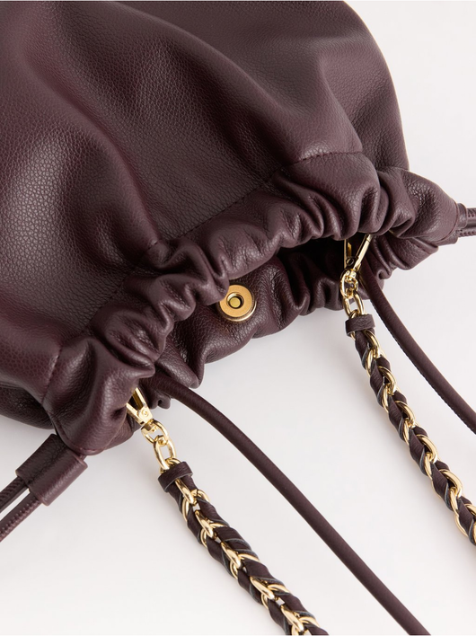 Stylish, shoulder bag in imitation leather with drawstring closure and removable chain handle.