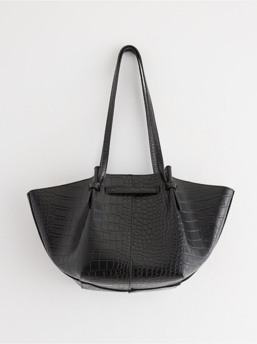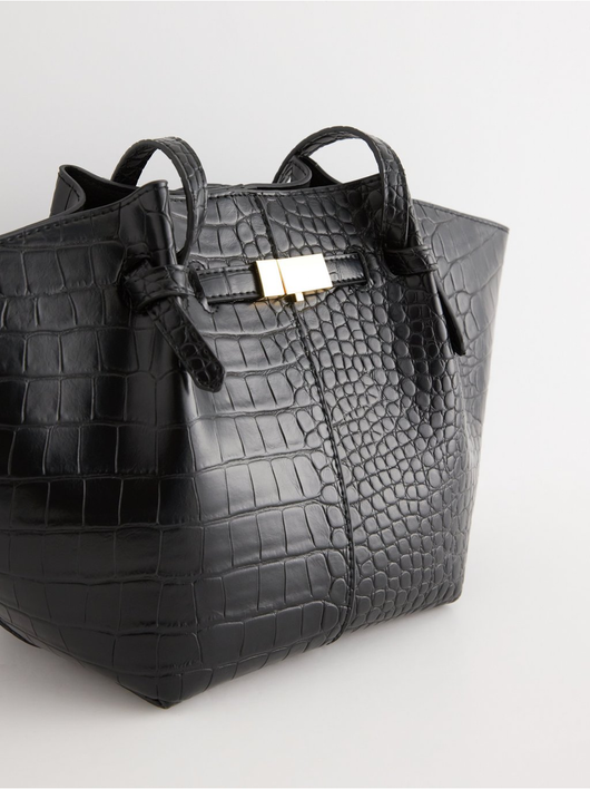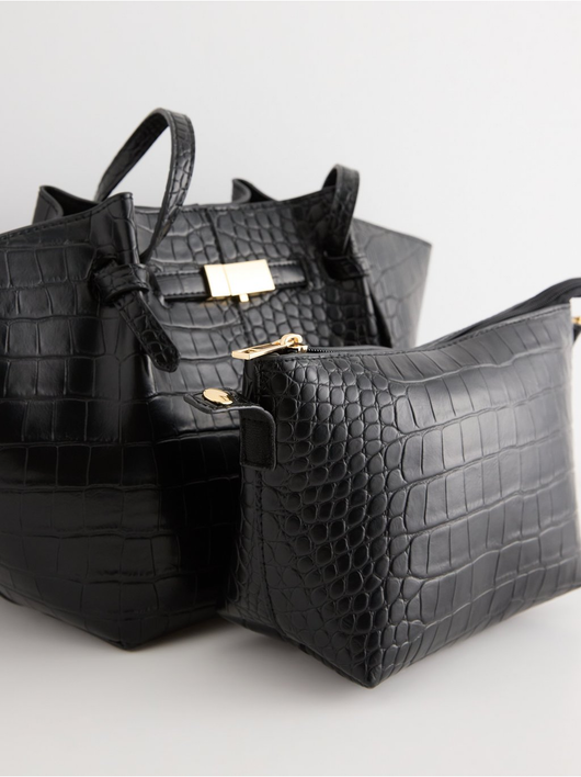 Midi sized bag in imitation leather with sleek design and gold coloured clasp. The bag has a detachable organizer bag inside.