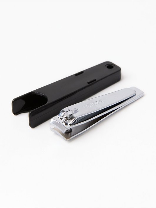 Small stainless steel nail clipper designed for fingernails. Clippings are neatly collected in the built-in sleeve – simply empty after each use.