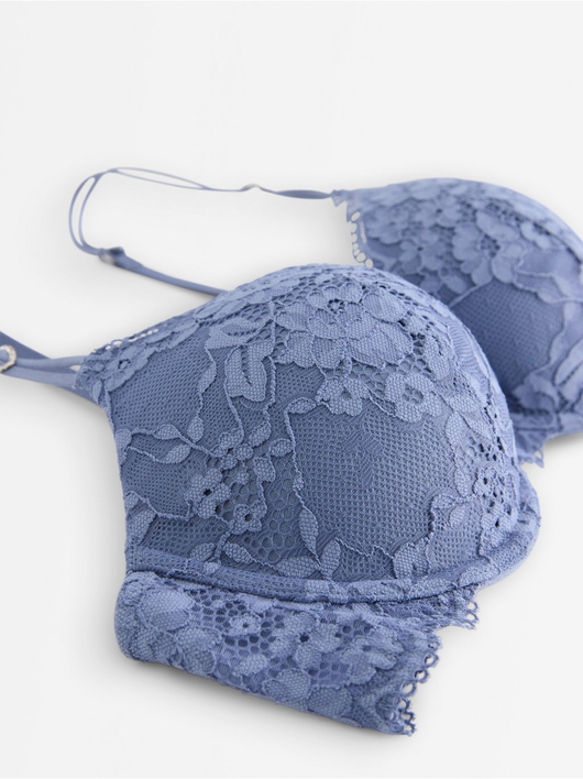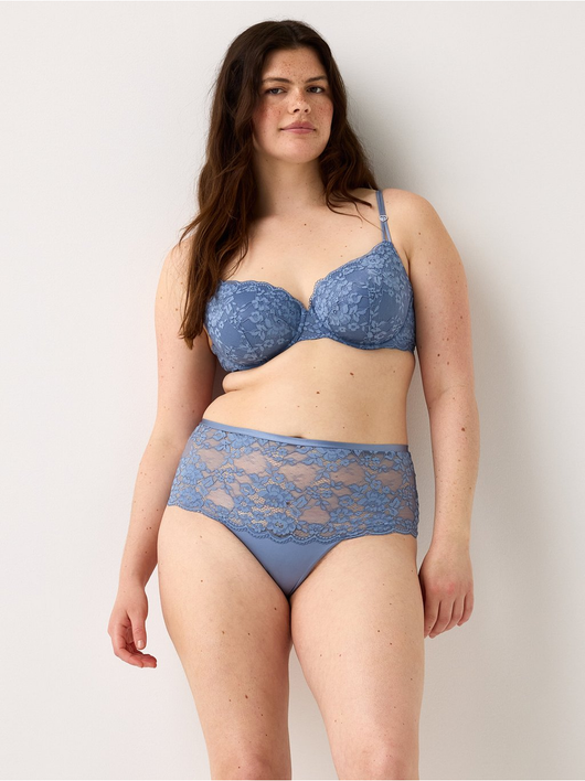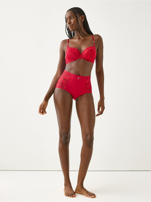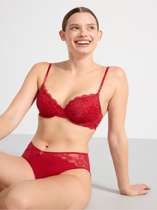 A comfortable t-shirt bra covered in soft lace with fine scalloped trims and heart details on the straps. The moulded cups come with thin padding and midi coverage.