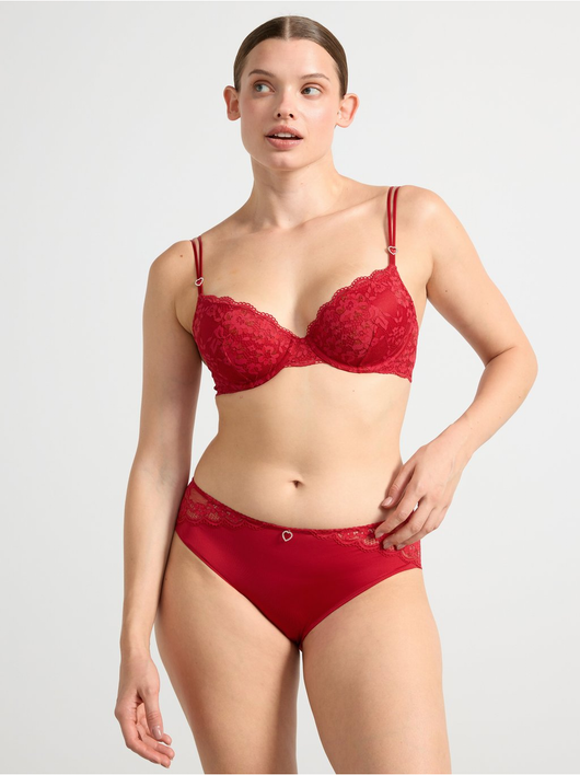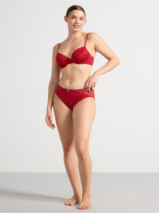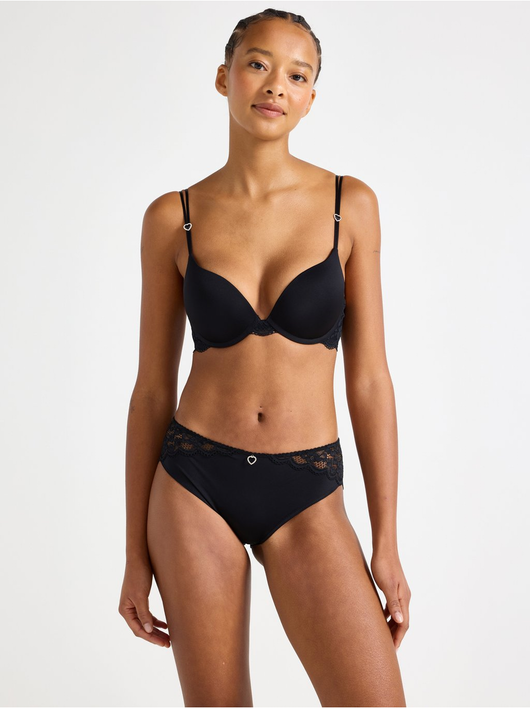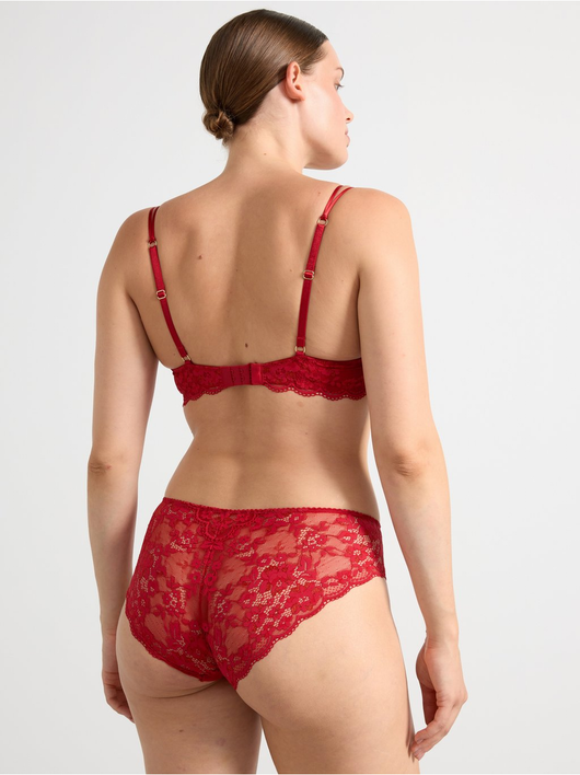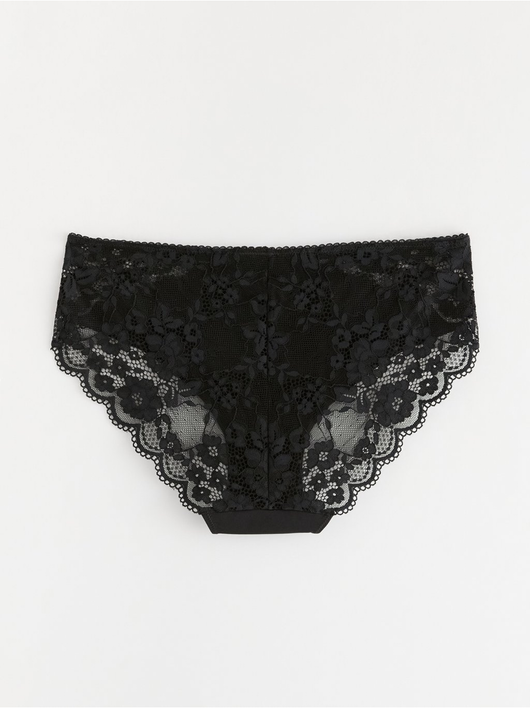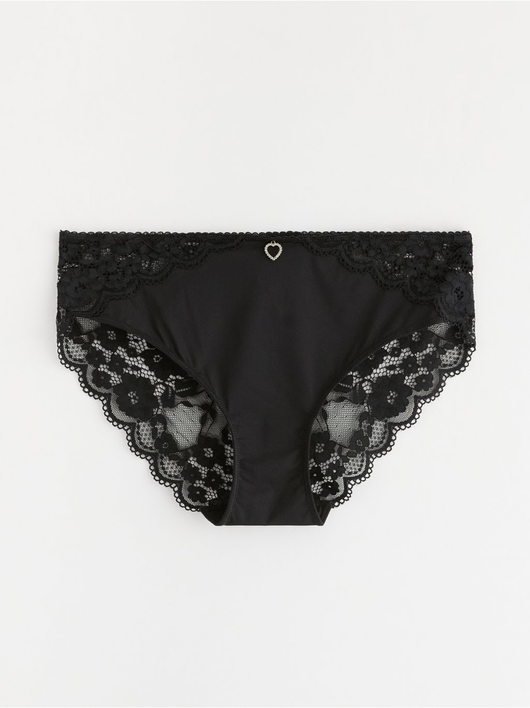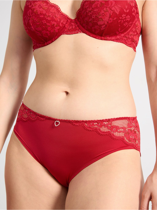 Briefs with lace along the waistband and back, and a small rhinestone detail at the front.