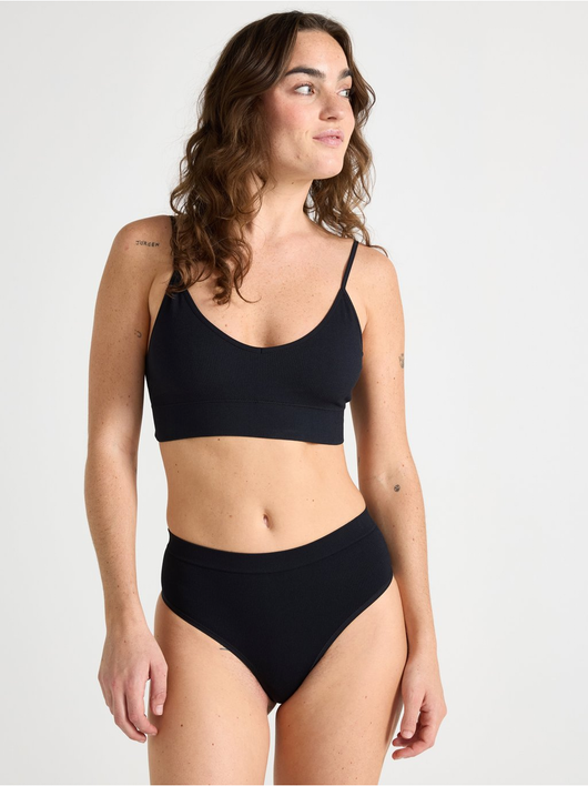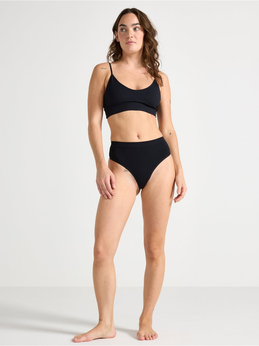 Thong with a high waist and high leg cut.