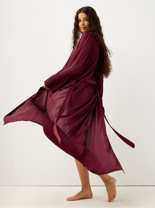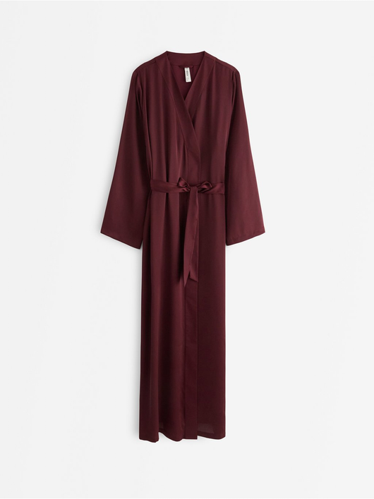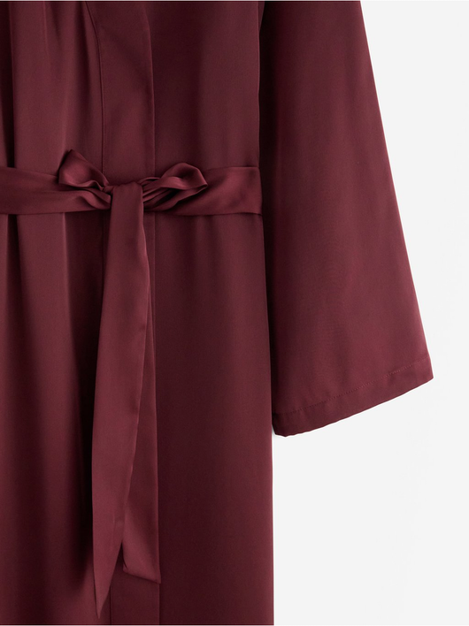 Sleek long robe in satin with a tie band at the waist.