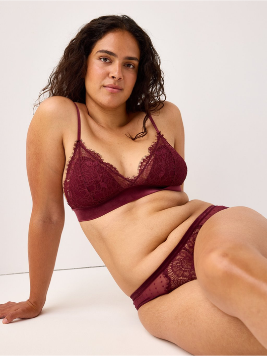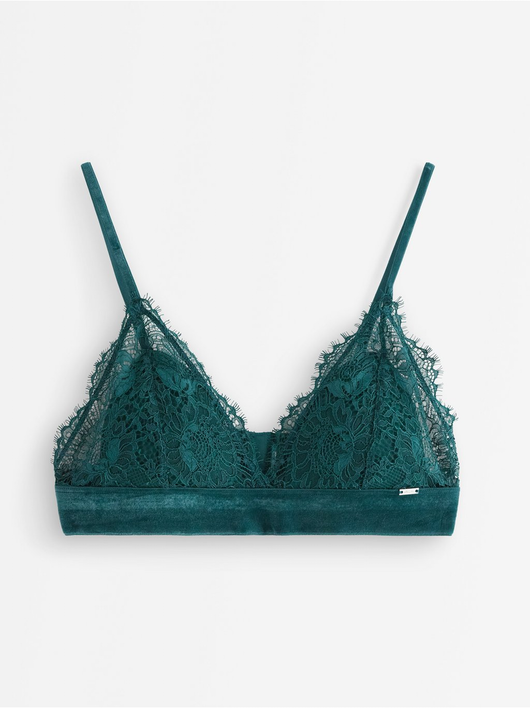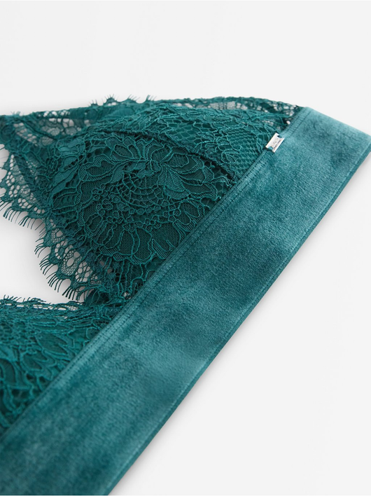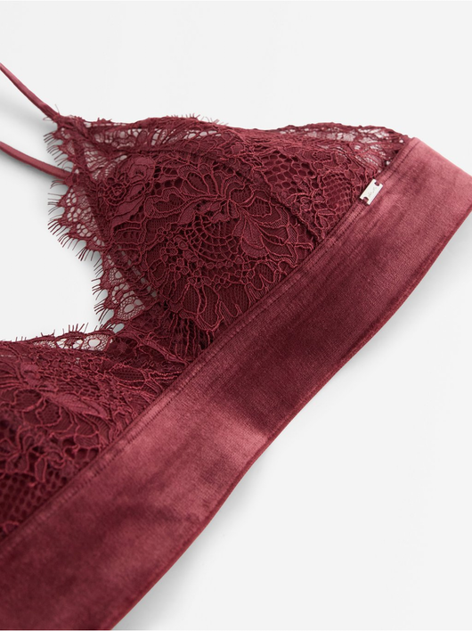 Soft padded bralette with lace and velvet with slim adjustable straps and scalloped trim.