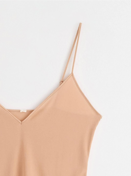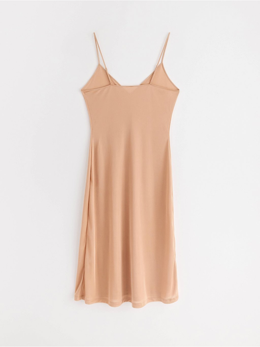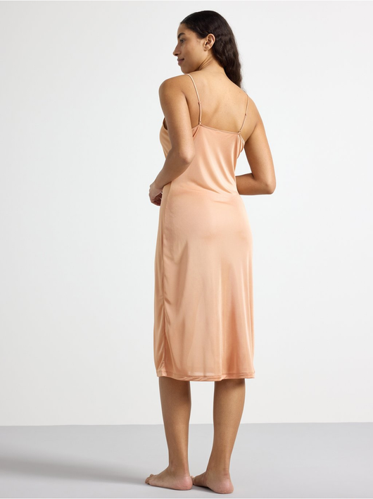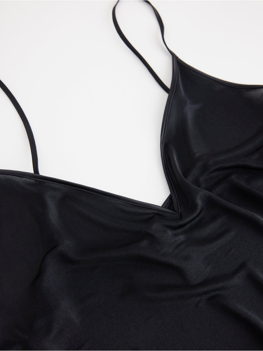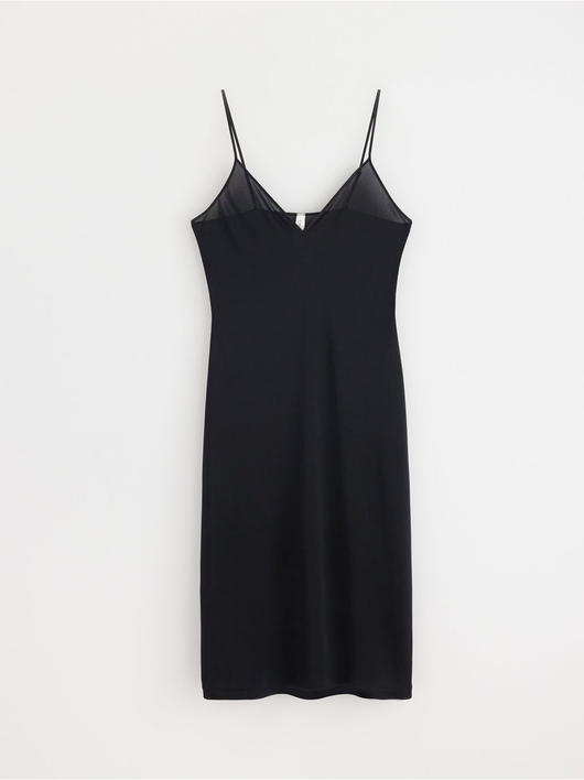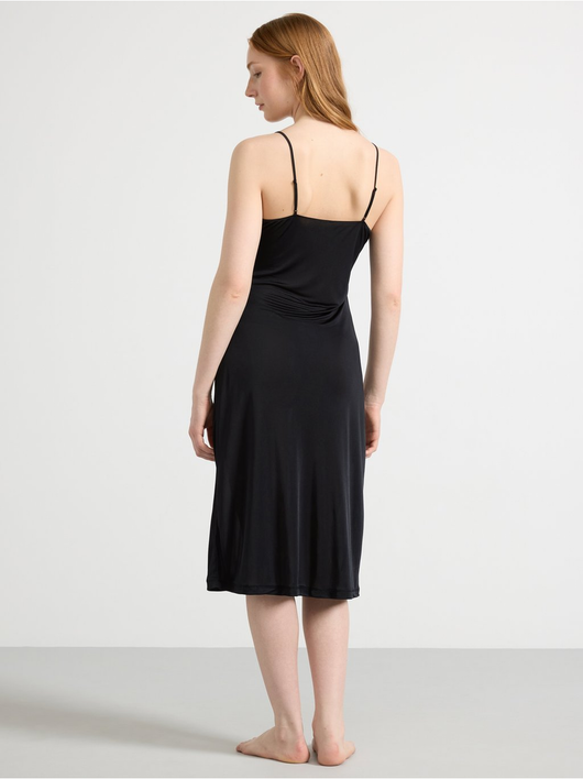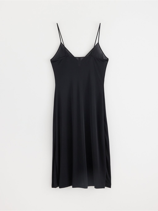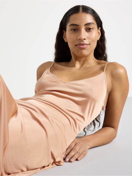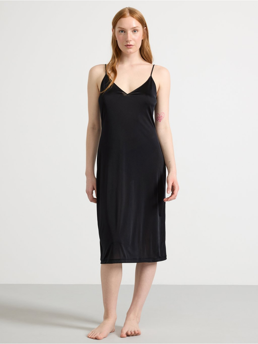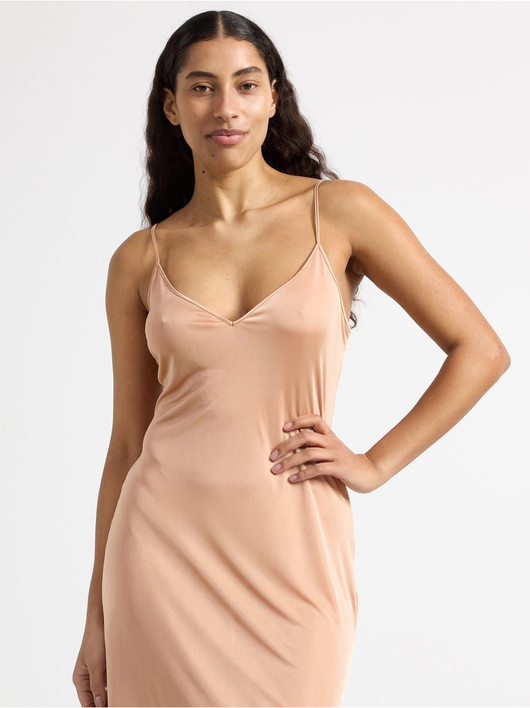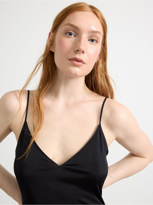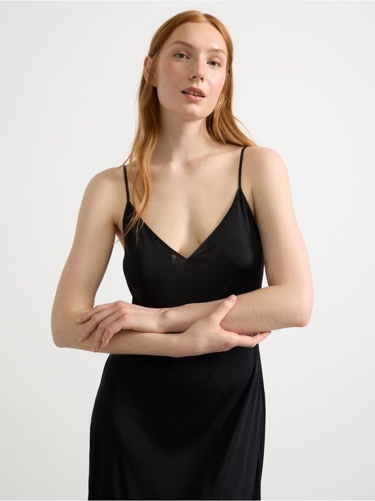 A soft, shiny slip dress in an antistatic fabric with a deep v-neck and slim shoulder straps.