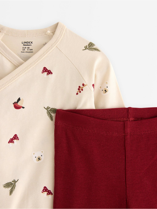 Comfortable set in soft cotton jersey with long-sleeved bodysuit and ribbed leggings. With our smart Extended size solution the baby can grow a size and still keep the same garment.