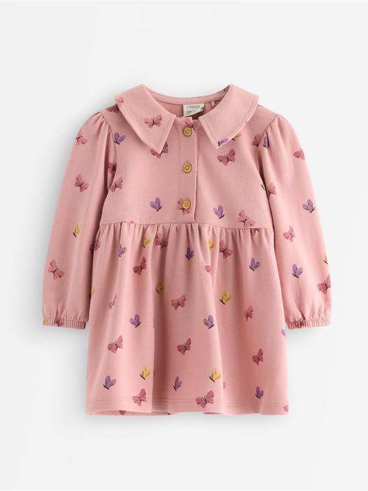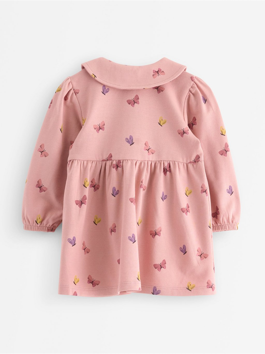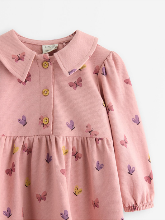 Long-sleeved dress in soft cotton jersey with collar, button placket, and a flared fit.