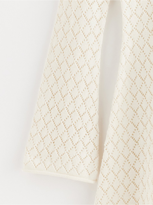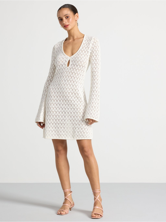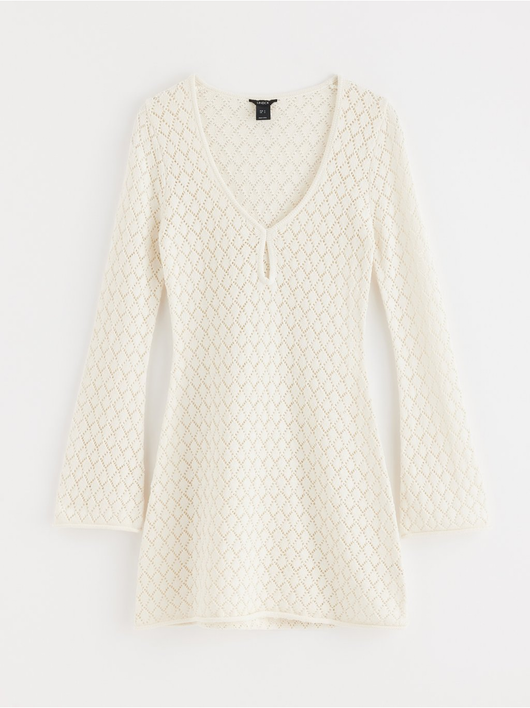 Knitted mini dress with long sleeves and flared skirt.