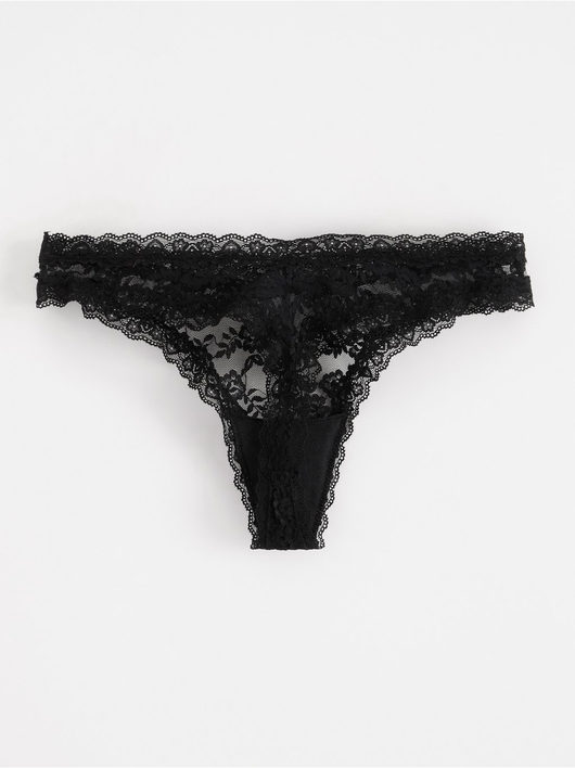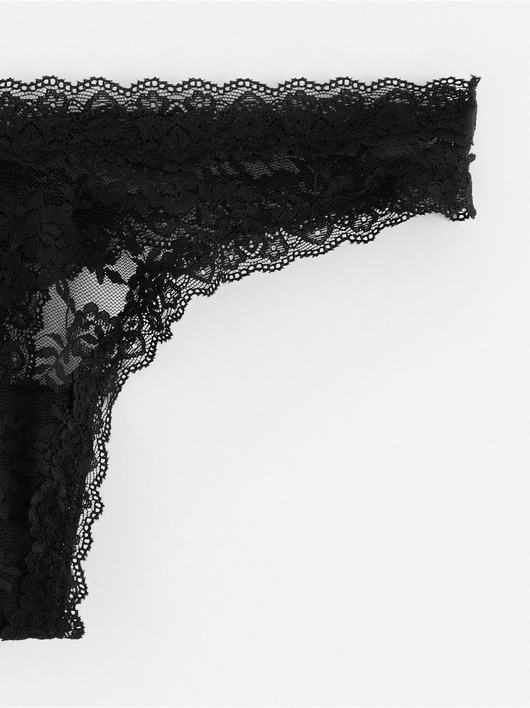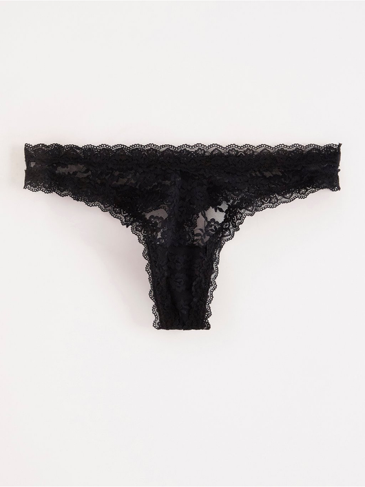Thong with low waist and high leg cut, made in sheer lace fabric with scalloped edges.