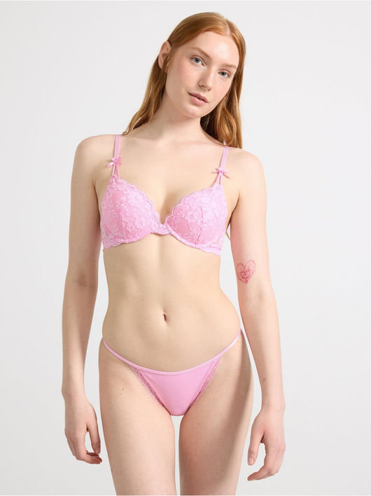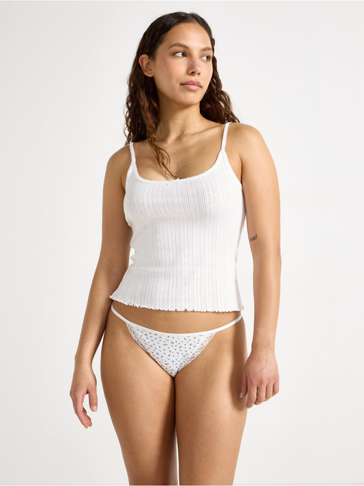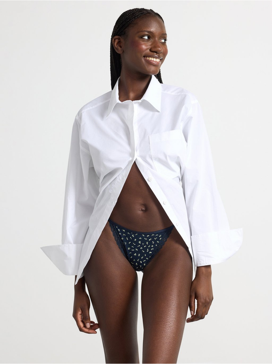 Cotton thong briefs with a lace trim and a low-rise waist.