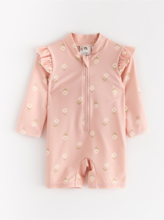 Swimwear with a UV-protective fabric and long sleeves. The swimwear has a zip at the front.