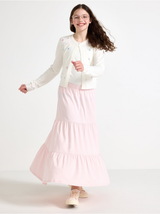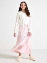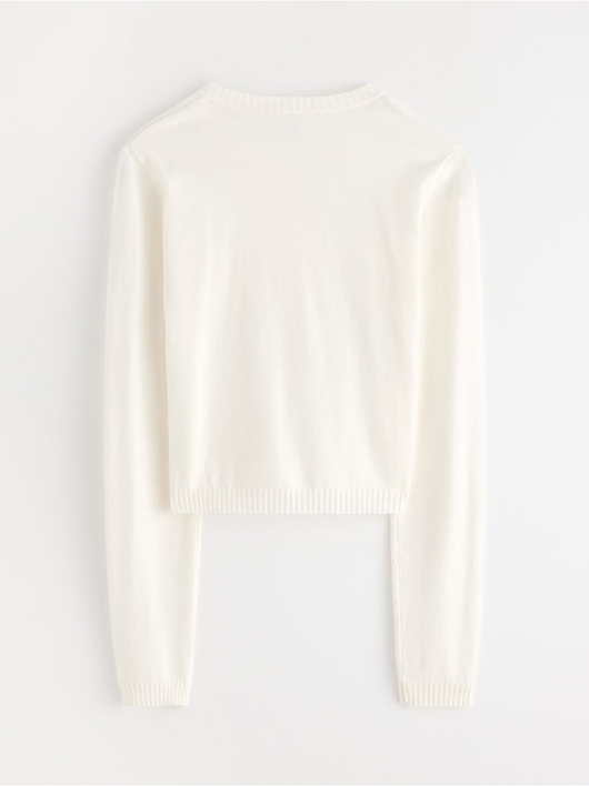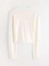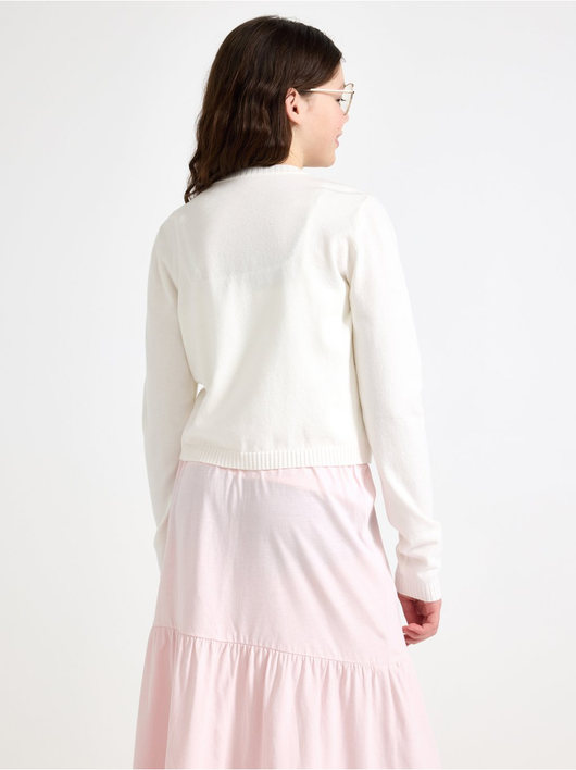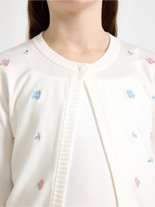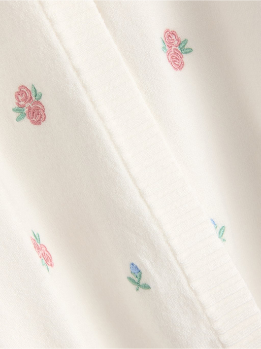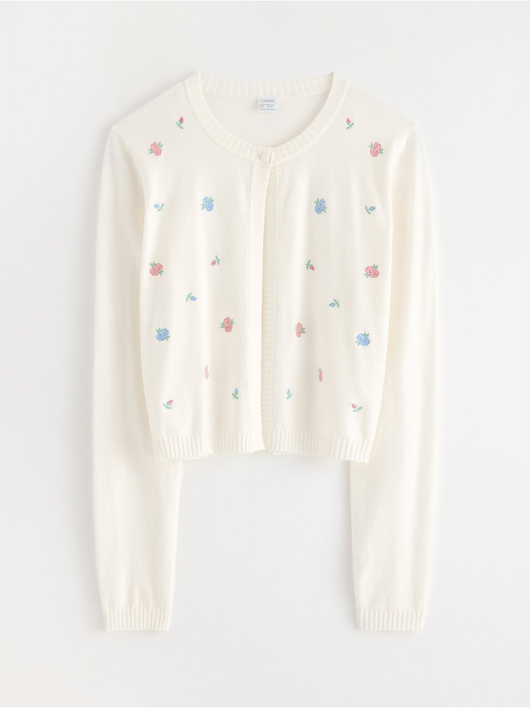 Fine-knitted cardigan in soft viscose blend with embroidered flowers and single button closure.