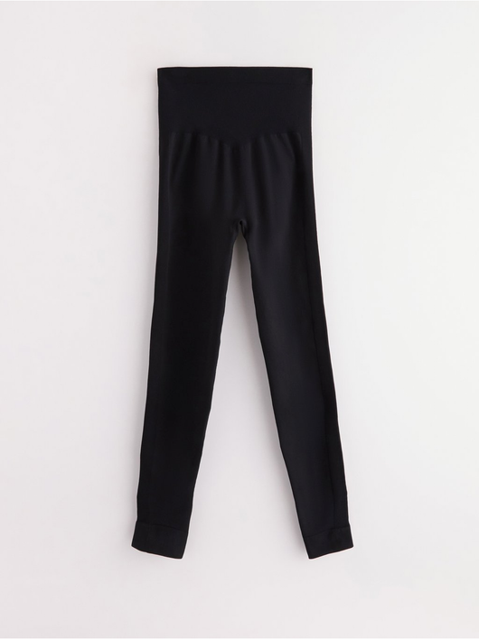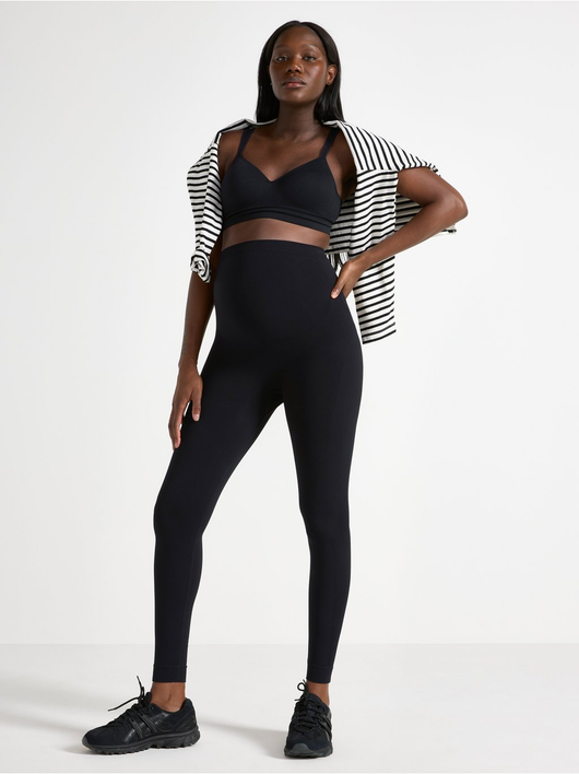 Stretchy maternity sports leggings with a wide waistband to fit a growing belly.