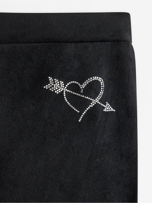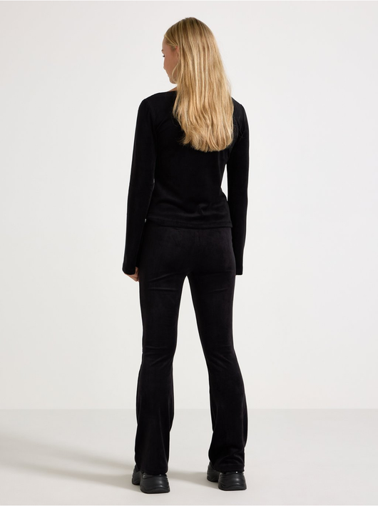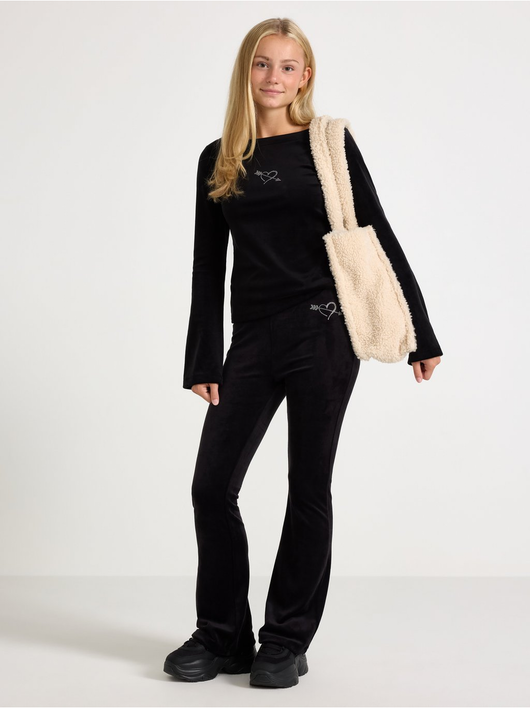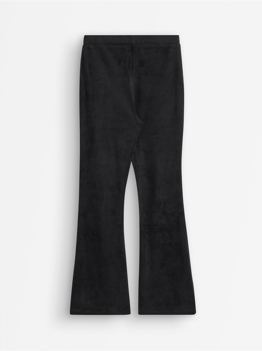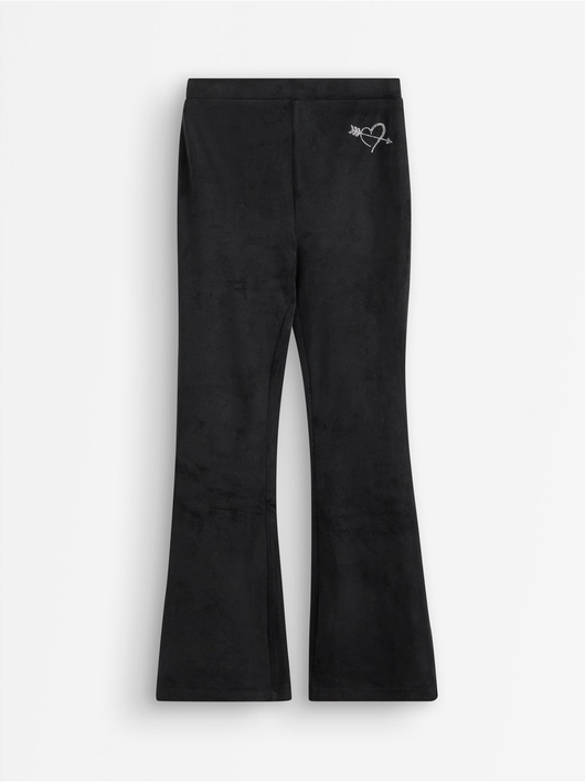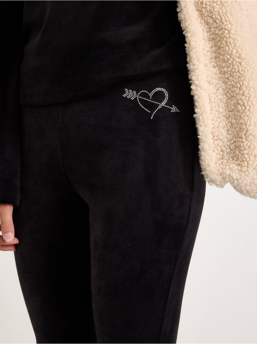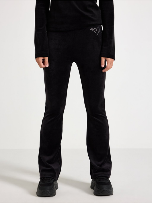 Comfy jersey trousers in soft velour with flared legs, elastic waist and a rhinestone detail at the front.