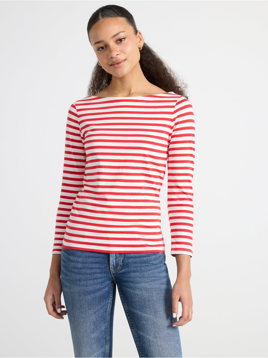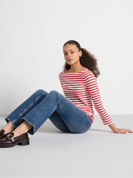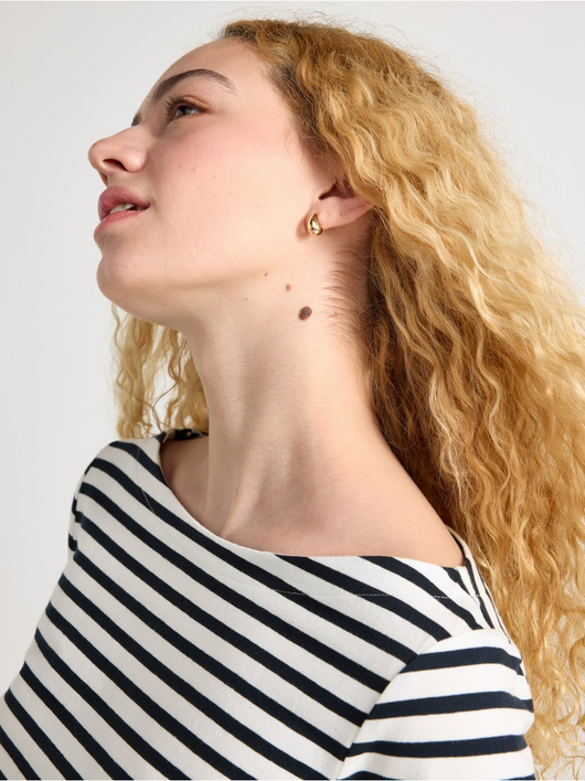 A super soft and comfy organic cotton top with round neckline, slightly cropped sleeve length and classic striped pattern.